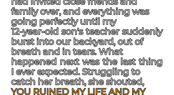 The aroma of grilled burgers, the cheerful chatter of loved ones – my 35th birthday party was everything I’d ever wanted. Surrounded by family and close friends, I felt like the luckiest person alive. Little did I know, this perfect facade was about to shatter in the most unimaginable way. Just as I was raising a toast, a figure stumbled into our backyard, disrupting the festive atmosphere. It was my 12-year-old son’s teacher, Mrs. Davison. But she was nothing like the composed, professional woman I knew from school conferences. Her face was blotchy and red, her eyes swollen with tears. She looked utterly distraught, like she’d run a marathon and then received the worst news of her life. The laughter died down, replaced by an uneasy silence as everyone turned to stare at the unexpected guest. The air crackled with tension, a stark contrast to the joyous mood just moments before. I noticed my son, Michael, looking particularly uncomfortable, shifting his weight from one foot to the other.