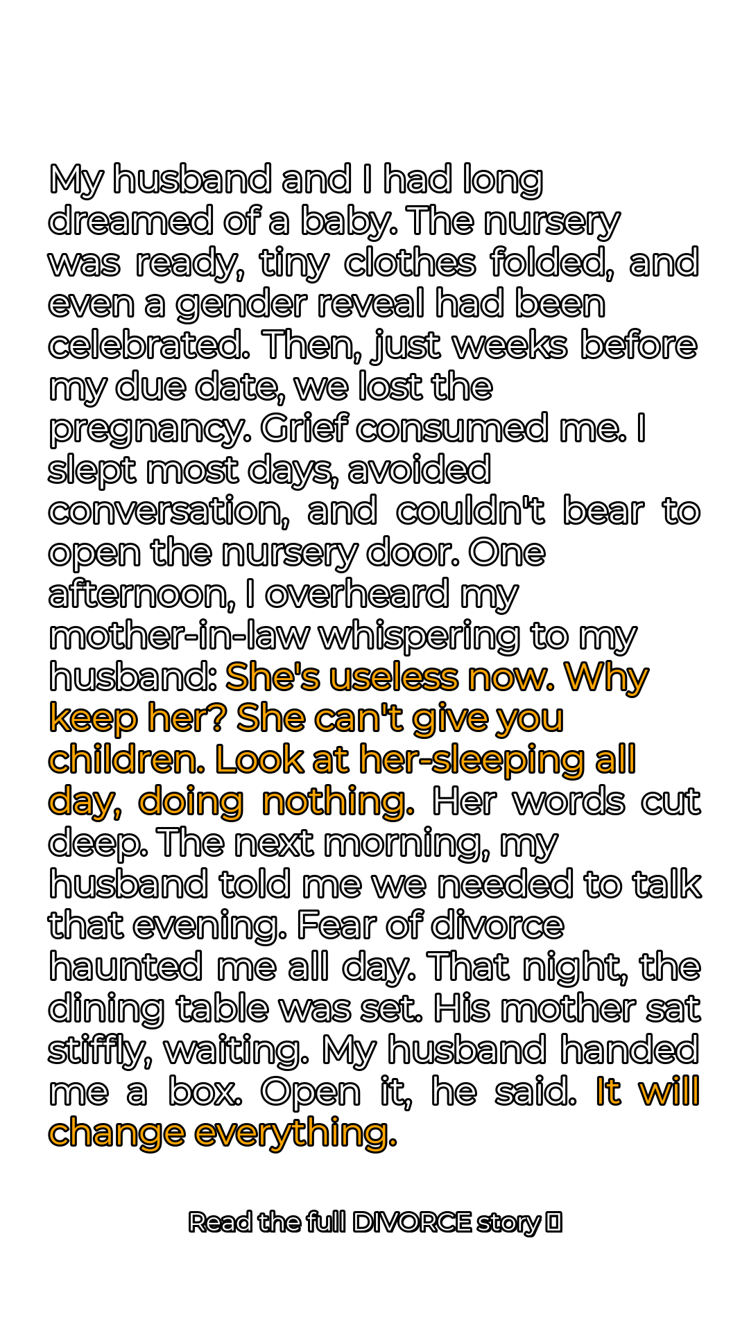 That evening, the dining table was meticulously set, an unusual occurrence for a weeknight. Patricia sat stiffly at one end, her expression unreadable. David entered the room, his face pale and drawn. He walked over to me and handed me a small, velvet box. “Open it,” he said, his voice flat and devoid of emotion. My hands trembled as I lifted the lid, revealing a delicate silver locket. Inside, nestled on a bed of velvet, was a tiny sonogram picture… not of the baby we lost, but of a NEW baby. He then coldly says [“PATRICIA IS PREGNANT!”]