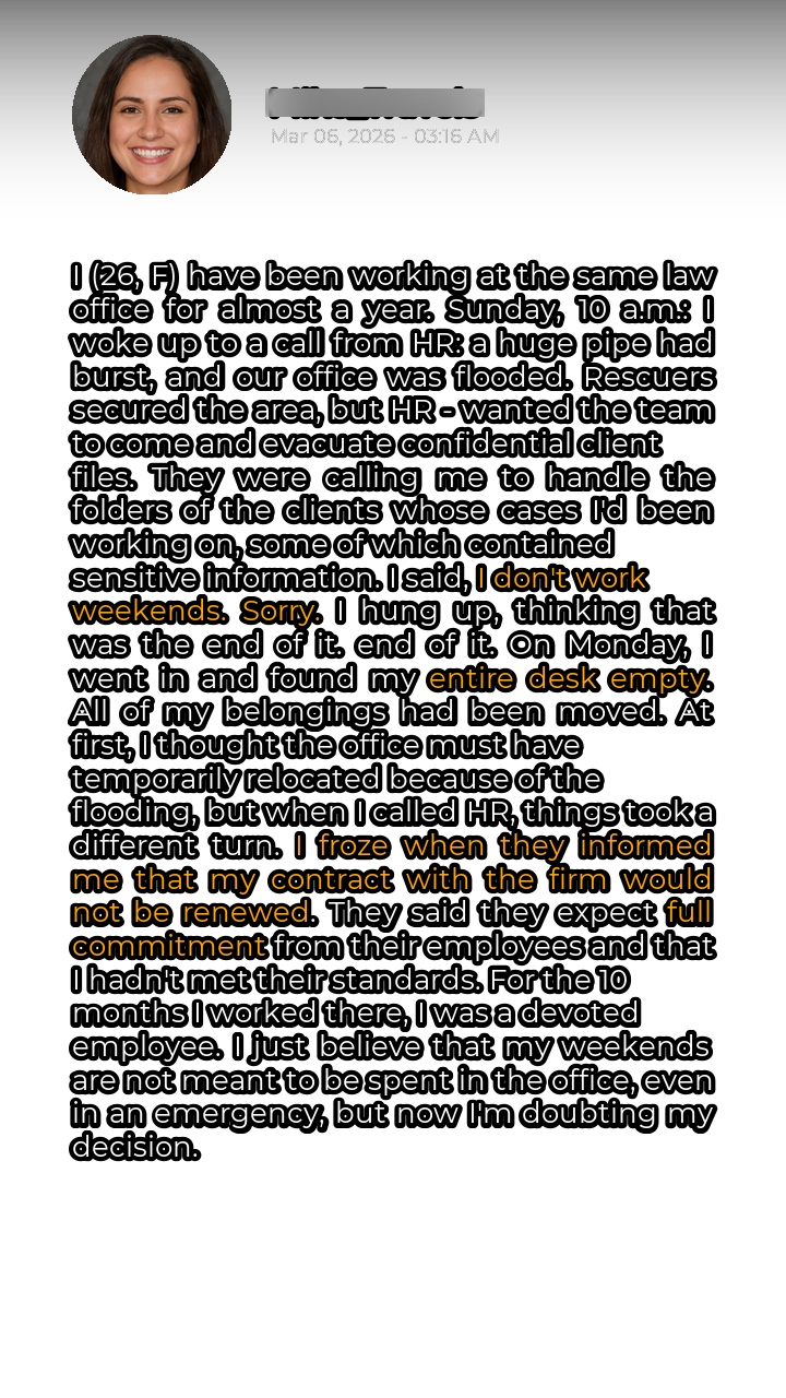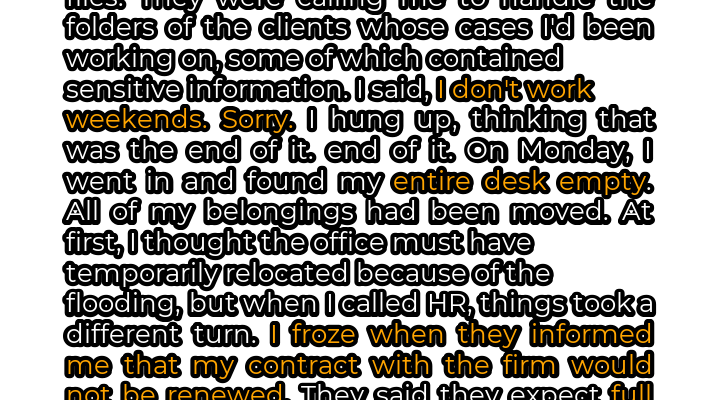 The fluorescent lights of the law office hummed with a monotonous buzz, a sound that had become the soundtrack to my life for the past ten months. At 26, I had finally landed what I thought was my dream job. The work was challenging, the colleagues were… mostly tolerable, and the pay was decent. I poured my heart and soul into my cases, working long hours and striving to exceed expectations. I genuinely believed I was a valuable asset to the firm. The shrill ring of my phone shattered the Sunday morning silence. Groggily, I reached for it, my mind still half-lost in sleep. The caller ID read ‘HR Department’. I had a sinking feeling. It was never good when HR called on a weekend. \