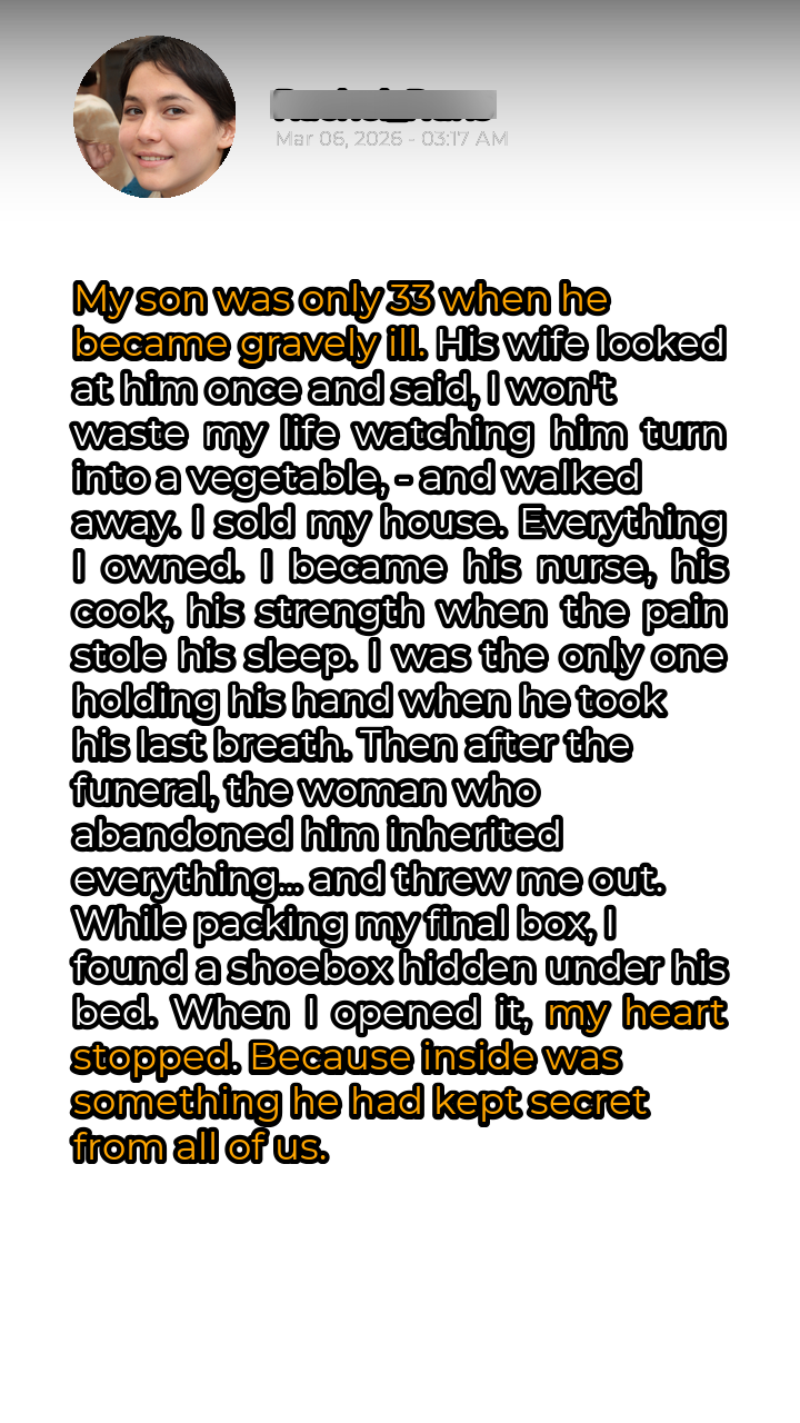Then came the final blow. Sarah, the woman who had abandoned him in his time of need, inherited everything. The house, the savings, everything David had worked for. And she wasted no time in evicting me, the woman who had sacrificed everything for him. I was packing my belongings, feeling utterly defeated and heartbroken, when I discovered a shoebox hidden under David’s bed. It was old, worn, and taped shut. Curiosity piqued, I pulled it out and placed it on the bed.
