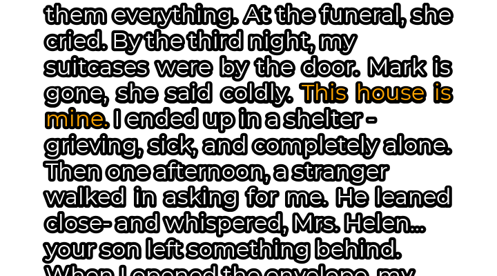 Helen’s world shattered the day she buried her son, Mark. The grief was a physical weight, crushing her spirit with each passing moment. She’d always been the rock of the family, the steady hand that guided them through life’s storms. Now, a storm of unimaginable proportions had struck, leaving her adrift in a sea of sorrow. Three days after the funeral, the unthinkable happened. Mark’s widow, Sarah, stood before Helen, her eyes cold and devoid of any warmth. Helen had sold her own beloved home years ago, pouring the money into this house, helping Mark and Sarah establish their lives. She had raised their children, filled their bellies with home-cooked meals, and poured every ounce of her love and energy into their family. At the funeral, Sarah had wept openly, clinging to Helen, a picture of grief-stricken widowhood. Now, the facade had crumbled.