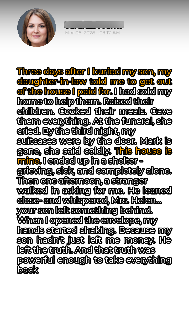 He handed her a sealed envelope, his eyes filled with a knowing sadness. Helen’s hands trembled as she tore it open. Inside, she found a letter and several documents. As she read, her heart pounded in her chest, her mind reeling from the revelation. Mark hadn’t just left her money; he had left her the truth. And that truth was [ “that he had secretly divorced Sarah months before he died and the house was solely in his name, now inherited by his mother” ]. The papers included a will and the divorce decree.