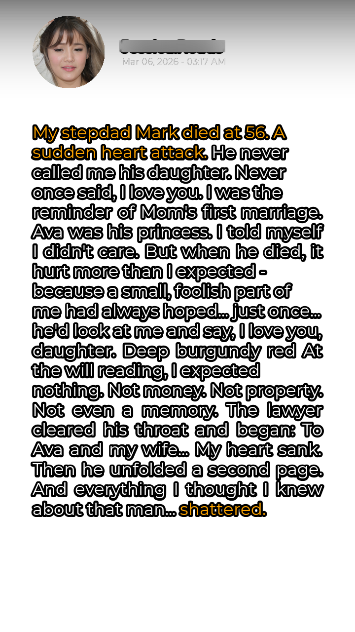 Mark, my stepdad, passed away unexpectedly at 56 from a sudden heart attack. Our relationship was⦠complicated, to say the least. For 20 years, he never once called me his daughter. Never uttered those three simple words, “I love you.” I was a constant reminder of my mom’s first marriage, a ghost from a life he seemingly wanted to erase. Ava, his biological daughter, was his princess. The sun rose and set with her. I tried to convince myself that I didn’t care, that his indifference didn’t sting. I buried the yearning deep, telling myself I was better off without his affection. But beneath the surface, a fragile hope flickered. A silly, childish dream that one day, he would look at me with kindness, with acceptance, and say those longed-for words: “I love you, daughter.”