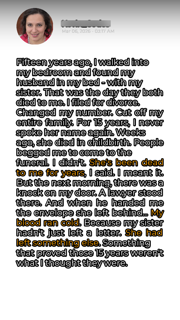 Fifteen years ago, I walked into my bedroom and found my husband in my bed – with my sister. The betrayal was absolute; my world imploded. I filed for divorce, changed my number, and severed all ties with my family, determined to erase them from my life completely. Fifteen years of silence. The memory still seared my mind: the tangled limbs, the look of guilt on their faces, the shattering of my naive belief in love and loyalty. I rebuilt my life brick by painful brick, creating a fortress of solitude around my wounded heart. I poured myself into my work, finding solace in the predictable order of spreadsheets and deadlines. I dated casually, but never allowed anyone to get close, forever haunted by the specter of betrayal.