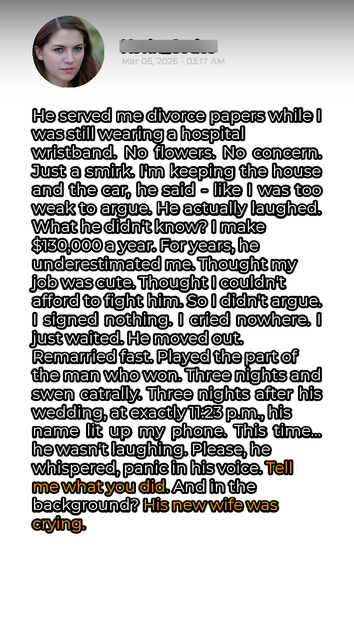 The sterile scent of the hospital room still clings to my memories, a constant reminder of the day my life fractured. The fluorescent lights hummed overhead, casting a harsh glare on the divorce papers he held out to me, his eyes devoid of any warmth or compassion. I was weak, still recovering, a hospital bracelet cutting into my skin, a symbol of my vulnerability at that very moment. He served me divorce papers as if I were a waitress and he was impatient to leave. His smirk, a grotesque distortion of the man I thought I knew, remains etched in my mind. Each word he uttered was a dagger twisting in my heart. \