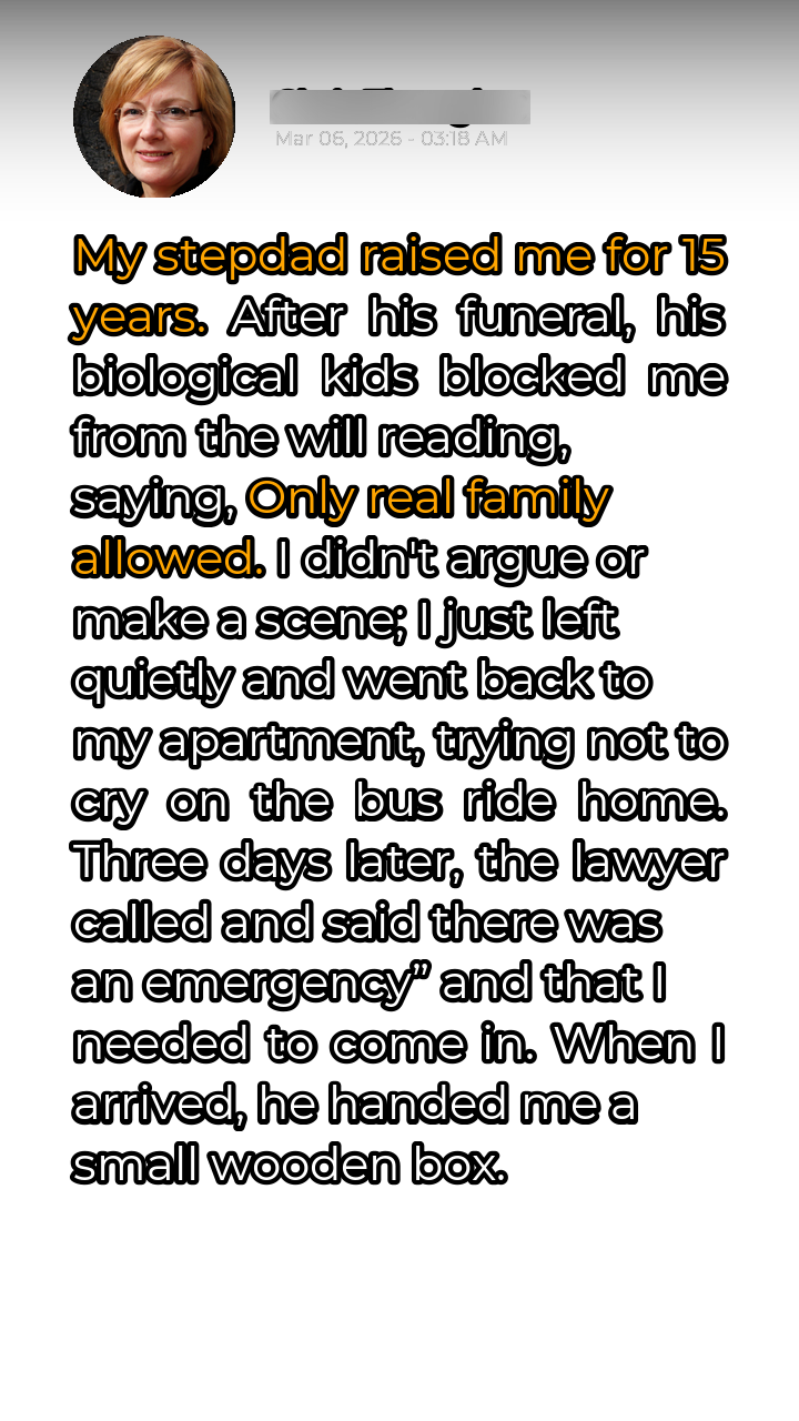 The letter concluded with a clear and unwavering directive: The will was to be amended, ensuring that I, his legally adopted daughter, would inherit everything. He trusted me to use it wisely, to honor his memory, and to live a life filled with love and happiness. The weight of the box, the weight of the letter, the weight of his love, threatened to crush me. The lawyer looked at me expectantly. What was I going to do? The biological kids would be furious. But he had done it. He was my real dad all along. Now, what happens to the family?