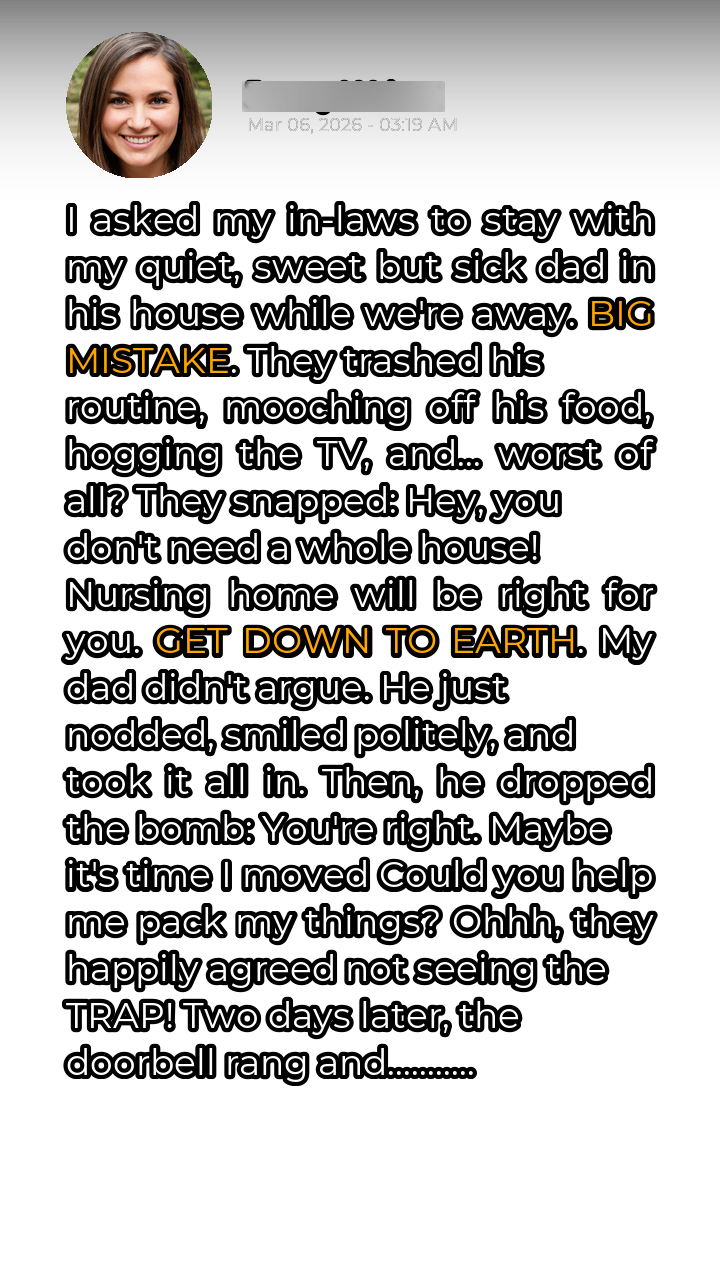 For two days, they bustled around my father’s house, sorting through his belongings with a ruthless efficiency. They discarded treasured mementos, judged his possessions, and generally made themselves insufferable. All the while, my father remained calm, his silence masking the storm brewing beneath the surface. Finally, the day arrived. The doorbell rang, shattering the tense anticipation that filled the air. My in-laws, beaming with pride, hurried to answer it, eager to witness the culmination of their efforts.