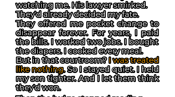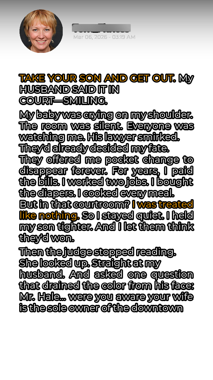 The courtroom air hung thick with tension, a palpable weight pressing down on my shoulders. My baby, Thomas, whimpered softly against me, his small body trembling in sync with my own. Across the room, Mark, my husband, delivered his blow with a chillingly calm demeanor, a smile playing on his lips as if he were discussing the weather. **”TAKE YOUR SON AND GET OUT,”** heâd declared, each word a shard of ice piercing my heart. I had dedicated years to our family, sacrificing dreams and ambitions, pouring my heart and soul into building a life alongside Mark. I worked tirelessly, balancing two jobs, barely scraping by, but always ensuring Thomas had everything he needed. Diapers, formula, doctor’s visits â I handled it all. I cooked every meal, cleaned every mess, and offered unwavering support, all while Mark pursued his career with single-minded focus. Now, here I was, being dismissed as if my contributions were worthless.