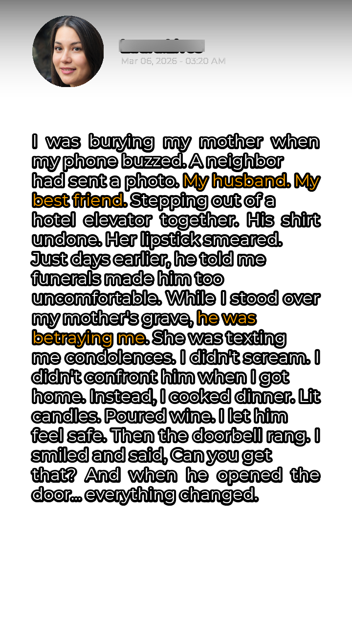 The November air bit with a ferocity that mirrored the ache in my heart. Gray skies wept alongside me as I stood beside my mother’s freshly dug grave, the scent of damp earth clinging to my woolen coat. Each shovelful of dirt that landed on the casket felt like another piece of my soul being buried with her. My mother, my rock, my confidante, gone too soon. Just as the pastor began his final prayer, a vibration jolted me. My phone. I almost ignored it, the ringing a disrespectful intrusion on this sacred moment. But another buzz followed, and then another. Frowning, I slipped the phone from my pocket, my thumb instinctively silencing the persistent clamor. A new photo from Sarah, our neighbor. My best friend. My heart stuttered. It was a candid shot, grainy and taken from a distance, but unmistakable. My husband, Mark, stepping out of a hotel elevator, his tie askew, the top buttons of his shirt carelessly undone. Beside him, Sarah, her usually impeccable red lipstick smeared slightly off-center. The image screamed of a night far removed from offering condolences and somber reflection.