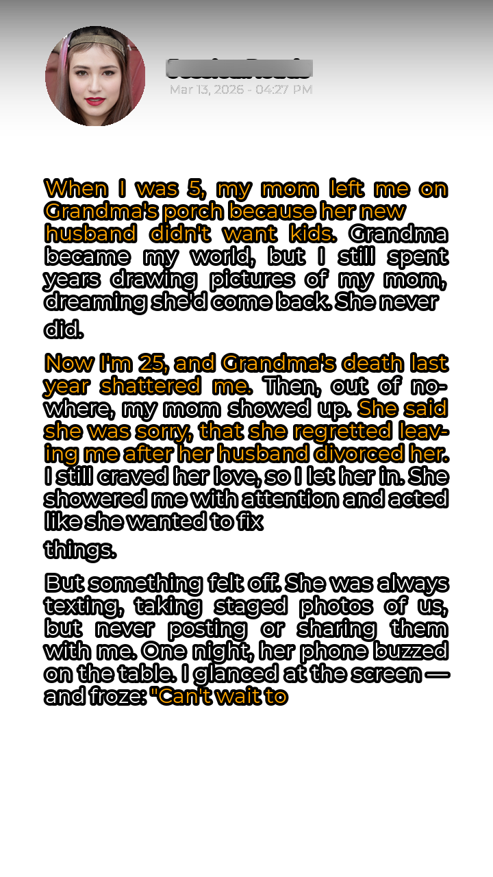The chill of abandonment settled deep within me at the tender age of five. My mother, the woman who was supposed to be my safe harbor, left me on my grandmother’s porch, a casualty of her new marriage. Her husband didn’t want children, and apparently, my existence was too inconvenient. Grandma, a beacon of unwavering love, stepped in, becoming my everything. Yet, despite her devotion, a part of me always ached for my mother’s return. I spent countless hours drawing pictures of her, fantasizing about the day she would come back and claim me as her own. But that day never came. Years turned into decades, and the dream of a mother’s embrace began to fade, replaced by a quiet acceptance of my reality. Then, last year, Grandma passed away. Her loss was a cataclysmic event, shaking the very foundations of my world. Just when I thought I couldn’t bear any more pain, my mother reappeared. Twenty years had passed, etching lines of regret on her face. She confessed her sorrow, explaining that her husband had divorced her years ago, leaving her free to reconnect. The desperate longing for her love, buried deep within my heart, resurfaced. I hesitantly allowed her back into my life.