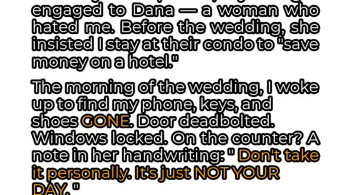 That morning, I woke up to absolute silence. My phone was gone. My keys, vanished. Even my shoes were missing. Panic seized me as I rushed to the door, only to find it deadbolted. A chilling note lay on the kitchen counter, its message confirming my worst fears. Dana had orchestrated this, locking me in to prevent me from attending the wedding. Tears welled in my eyes as I read her cruel words: “Don’t take it personally. It’s just NOT YOUR DAY.”