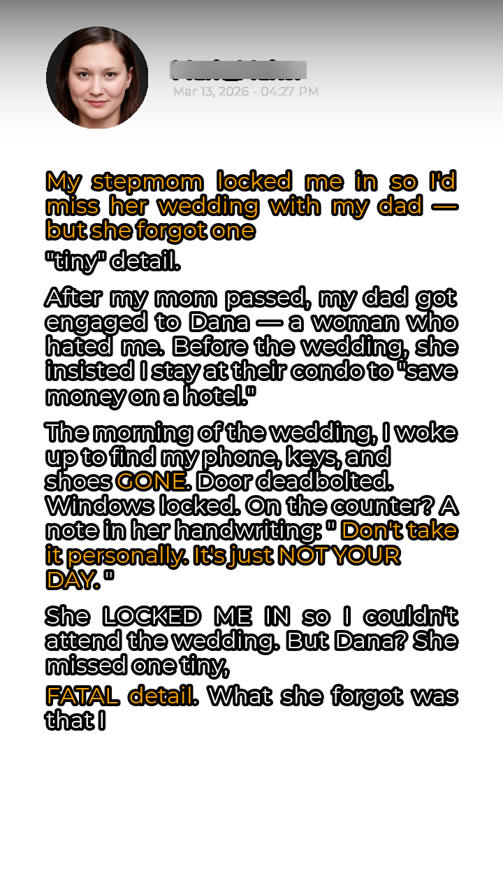 My world crumbled when my mom passed away. Dad, understandably, was devastated. Then came Dana. From day one, she made it clear she wasn’t interested in being a stepmother. More like a wicked stepsister, actually. The animosity was palpable, a constant undercurrent in our already strained household. When Dad announced their engagement, I tried to be happy for him, but a knot of dread formed in my stomach. This woman was going to be a permanent fixture in our lives, and she clearly wanted me gone. The weeks leading up to the wedding were tense. Dana became increasingly controlling, dictating every aspect of the celebration. Then came her “generous” offer: to have me stay at their condo the night before the wedding, ostensibly to save on hotel costs. Naively, I accepted. I should have known better. The moment I walked through that door, I felt a sense of unease, a feeling that I was walking into a trap.