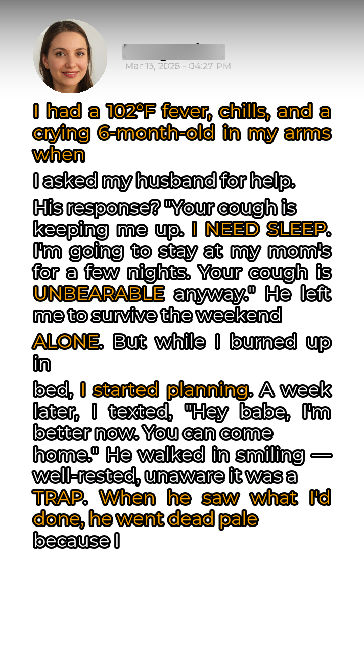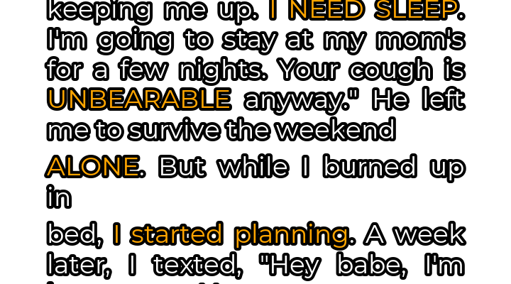 Then came the blow that shattered whatever remained of my faith in him. “I’m going to stay at my mom’s for a few nights,” he announced, finally glancing at me with a look of annoyance. “Your cough is UNBEARABLE anyway.” He packed a bag, kissed Lily on the forehead (but not me), and walked out the door, leaving me to fend for myself.