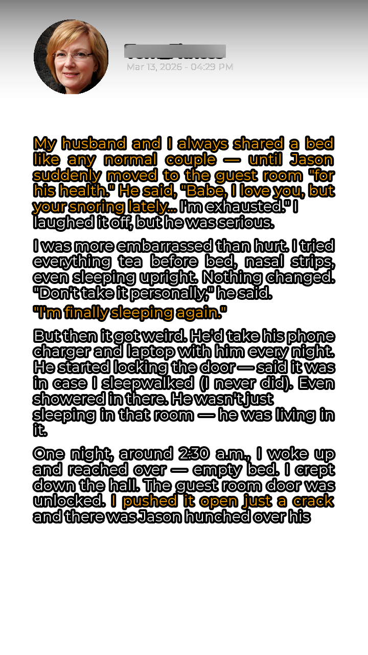 My husband and I had what I thought was a perfectly normal marriage. We shared a bed, shared our lives, and shared our dreams. That is, until Jason abruptly announced he was relocating to the guest room. His reasoning? My snoring. “Babe, I love you,” he said, his face etched with exhaustion, “but your snoring lately is keeping me up all night. I’m wrecked.” I initially dismissed it as a joke, but his somber expression quickly revealed the gravity of the situation. Initially, I felt more humiliated than hurt. I mean, who wants to be told their snoring is so bad it drives their partner out of the bedroom? Determined to remedy the situation, I embarked on a quest to silence my nocturnal symphony. I tried everything: herbal teas before bed, those ridiculous nasal strips, even attempting to sleep in a semi-upright position. Nothing worked. Jason, meanwhile, seemed to thrive in his newfound solitude. “Don’t take it personally,” he’d say, a smug look on his face. “I’m finally sleeping again.”