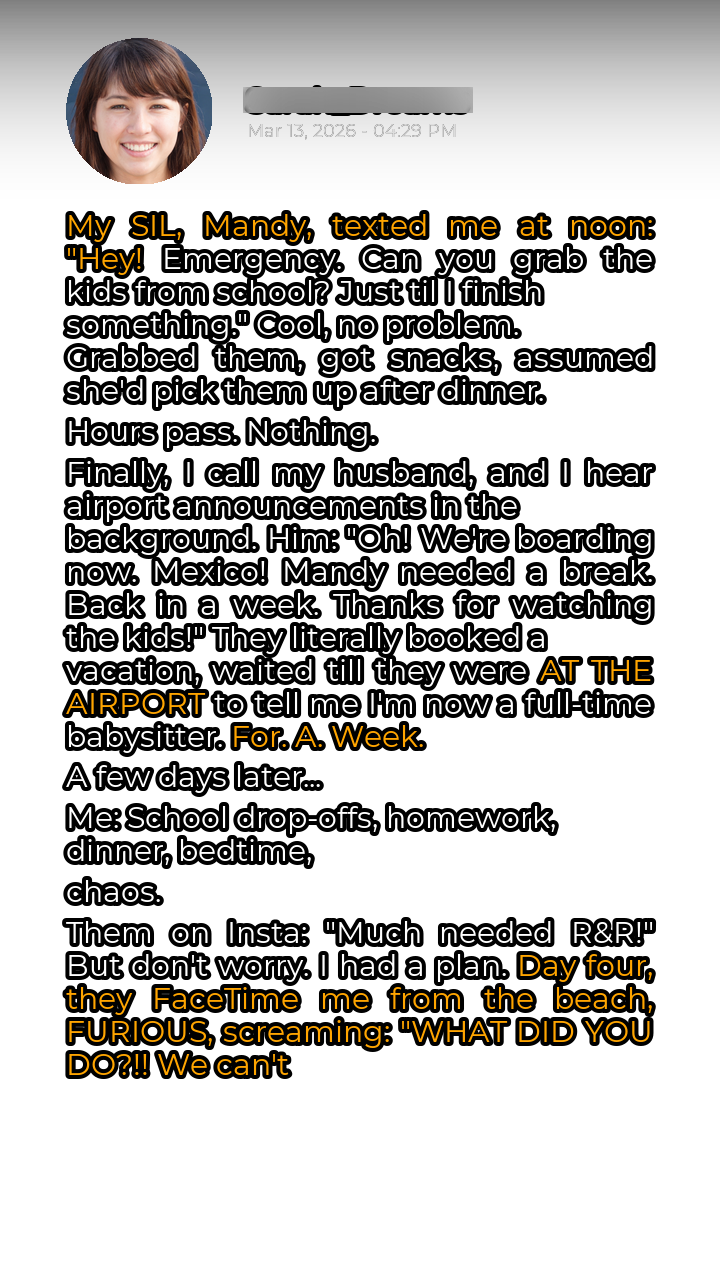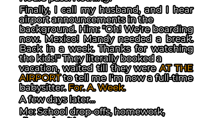 “Oh! We’re boarding now. Mexico! Mandy needed a break. Back in a week. Thanks for watching the kids!” My jaw dropped. They had orchestrated a vacation, waiting until they were practically airborne to drop the bomb that I was now a full-time, unpaid nanny. A week. Seven whole days of school drop-offs, homework battles, dinner prep, bedtime stories, and all the other joys of parenthood, without any of the planning or consent.