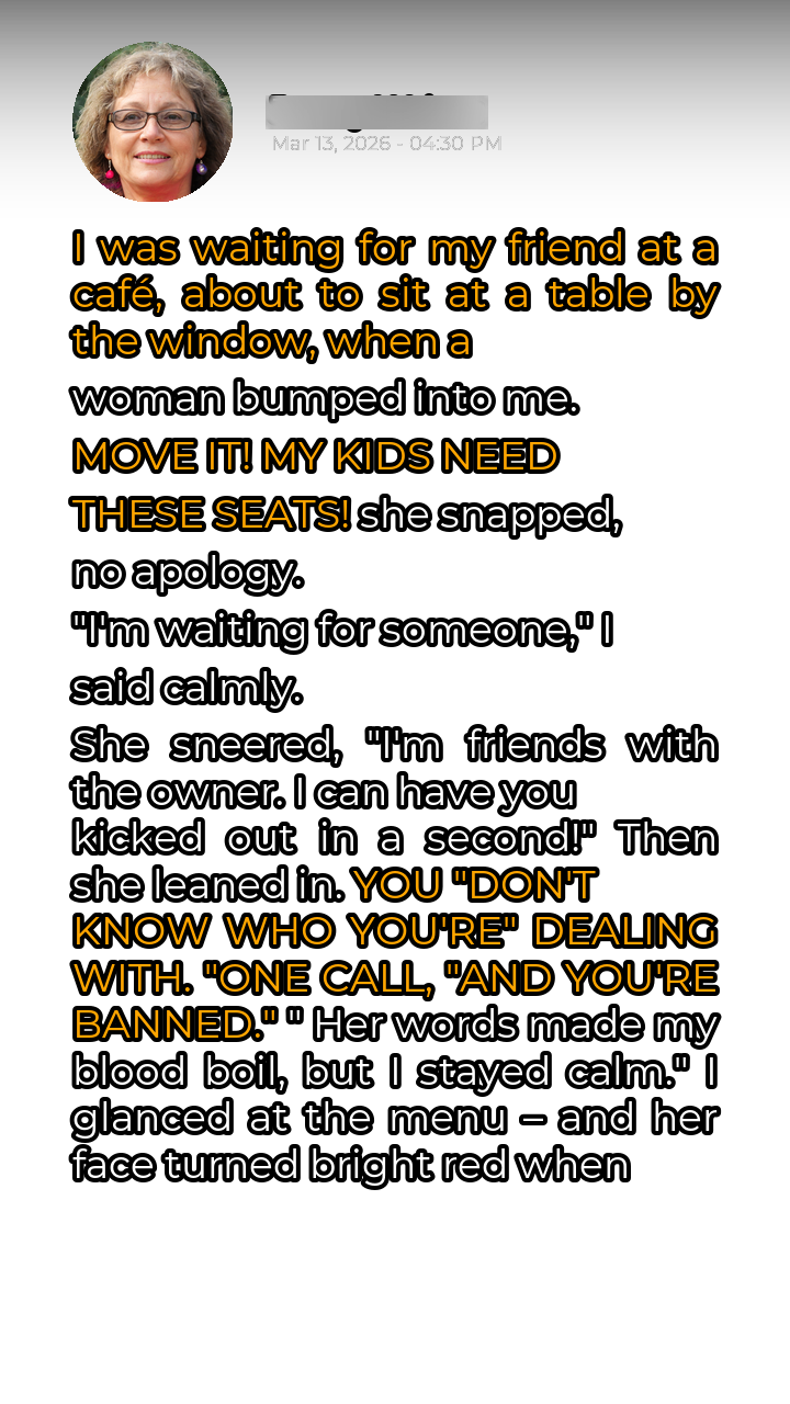 It was a typical Tuesday afternoon. I decided to grab a coffee while waiting for my friend Sarah to arrive. The quaint little café, “The Daily Grind,” was bustling with activity, a comforting hum of conversation filling the air. Spotting a vacant table by the window, I made my way towards it, eager to settle in with a latte and a good book. That’s when the collision occurred. A woman, seemingly in a frantic rush, slammed into me, nearly knocking me off my feet. Before I could even register an apology, she barked, “**MOVE IT! MY KIDS NEED THESE SEATS!**” Her tone was sharp, demanding, and utterly devoid of any basic courtesy. I was taken aback by her aggressive behavior, especially since there were other available tables in the café, albeit not as ideally situated by the window.