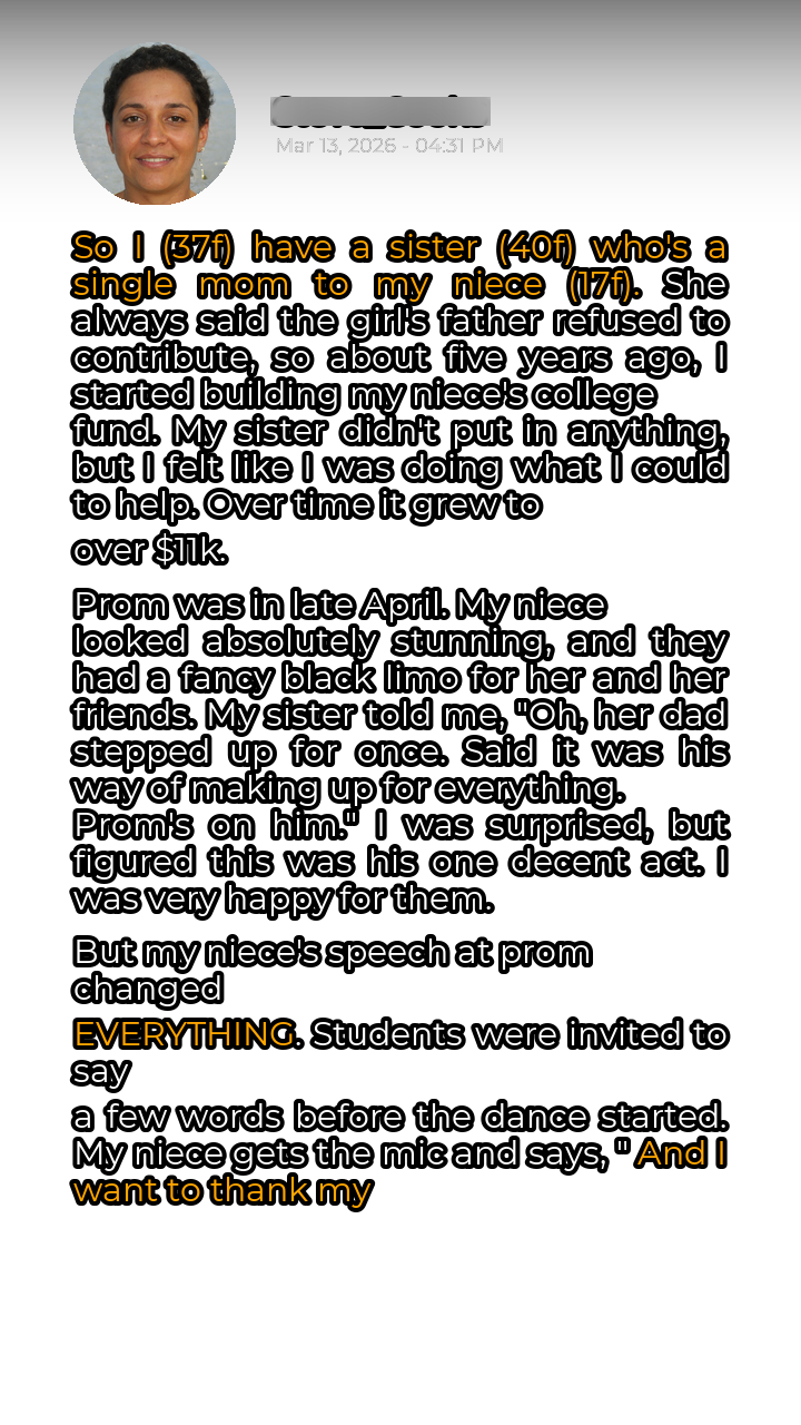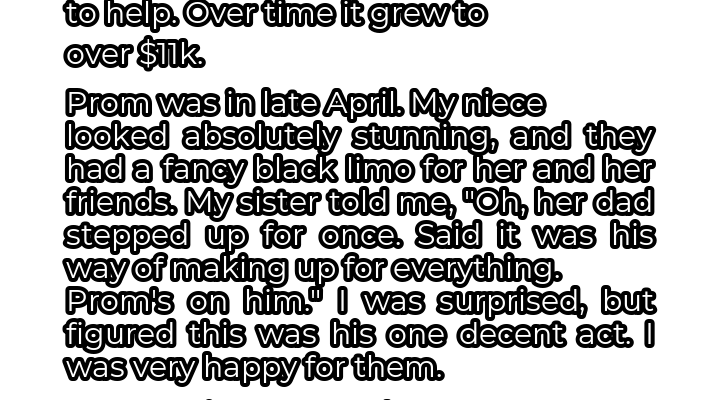 For years, I’ve played a significant role in my niece’s life, stepping in where her father seemingly failed to appear. My sister, a single mother, always lamented his absence and lack of financial support. So, about five years ago, driven by a desire to ensure a brighter future for my niece, I initiated a college fund. I diligently contributed, watching it slowly grow, surpassing $11,000. My sister, meanwhile, never added a single cent, but I didn’t mind. I believed I was doing the right thing, providing a safety net for my niece’s higher education. Prom night arrived, a momentous occasion filled with excitement and anticipation. My niece looked radiant, dressed in a stunning gown, ready to embark on an unforgettable evening. A sleek, black limousine awaited her and her friends, adding a touch of glamour to the event. My sister, with a proud smile, informed me that her ex, my niece’s father, had “stepped up for once,” claiming he wanted to compensate for his past shortcomings by covering the prom expenses. I was surprised, yet relieved, thinking it was a commendable gesture, a sign of belated responsibility. I genuinely felt happy for my niece, believing her father was finally making an effort.