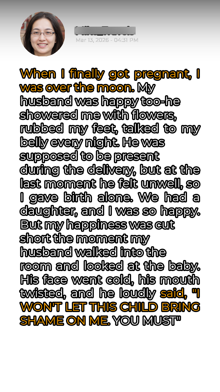 The silence in the room was deafening, broken only by Lily’s soft cooing. Then, Mark spoke, his voice a low, venomous hiss that sent shivers down my spine. “I won’t let this child bring shame on me,” he spat, his eyes narrowed. “You must…” He paused, his gaze hardening, “You must give her away.”