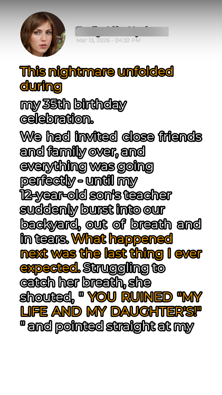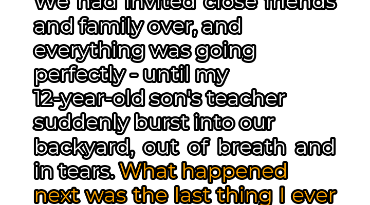 My 35th birthday party was shaping up to be everything I had hoped for. Close friends, family, good food, and sunshine filled my backyard. My 12-year-old son, Ethan, was happily playing with his cousins, and my husband, Mark, was manning the grill, expertly flipping burgers and hot dogs. The scene was idyllic, a snapshot of domestic contentment. That’s when the tranquility shattered. Mrs. Davison, Ethan’s usually composed and friendly teacher, appeared at the edge of the yard, her face a mask of distress. She was breathing heavily, her eyes red and swollen, as if she had been crying for hours. Before anyone could react, she charged forward, her voice cracking with emotion.