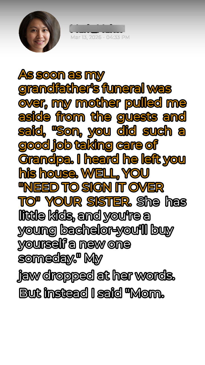 The somber air hung heavy, thick with the scent of lilies and unspoken grief. As the last of the mourners trickled away from the graveside, my mother’s hand found my arm, her grip surprisingly firm. The funeral had been a blur of polite condolences and forced smiles, but now, with the finality of Grandpa’s passing settling in, the real drama was about to begin. “Son,” she began, her voice low and laced with a practiced sincerity, “you did such a good job taking care of Grandpa. We all appreciate it.” I nodded, a lump forming in my throat. I’d spent the last year of his life tending to his needs, a task I undertook willingly, out of love and respect. I knew what was coming, I just didn’t expect her to be so blunt.