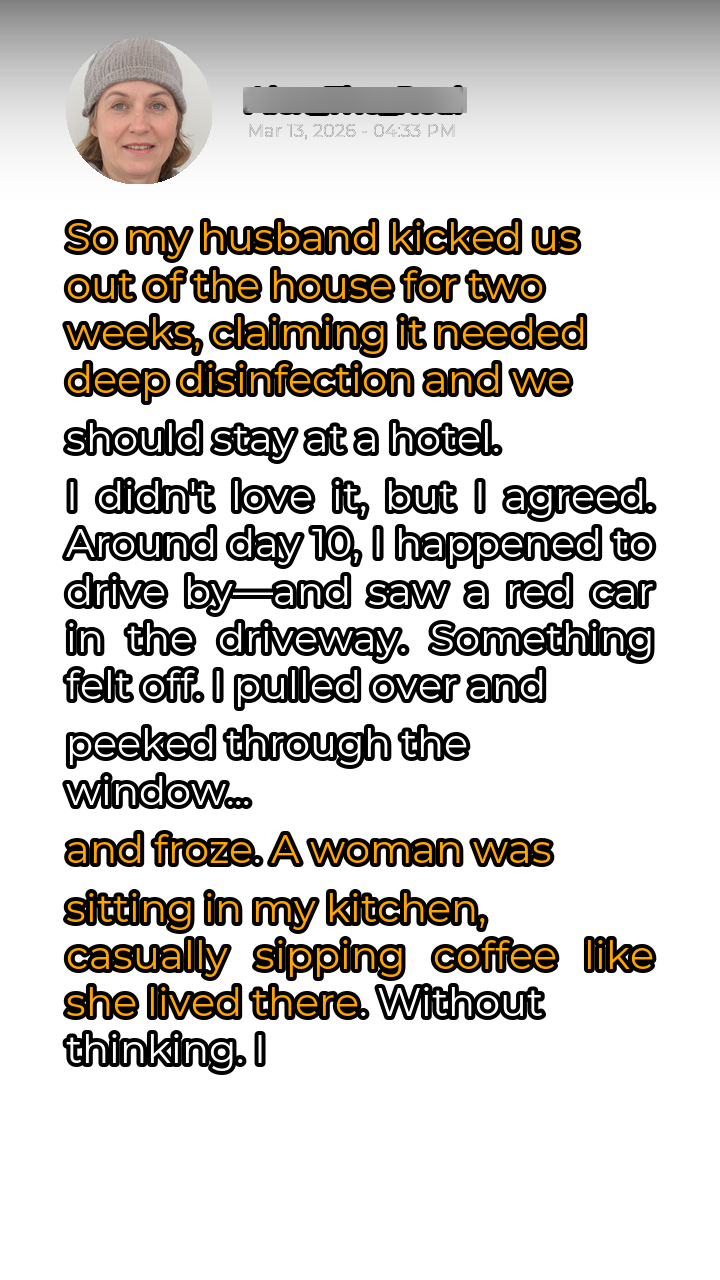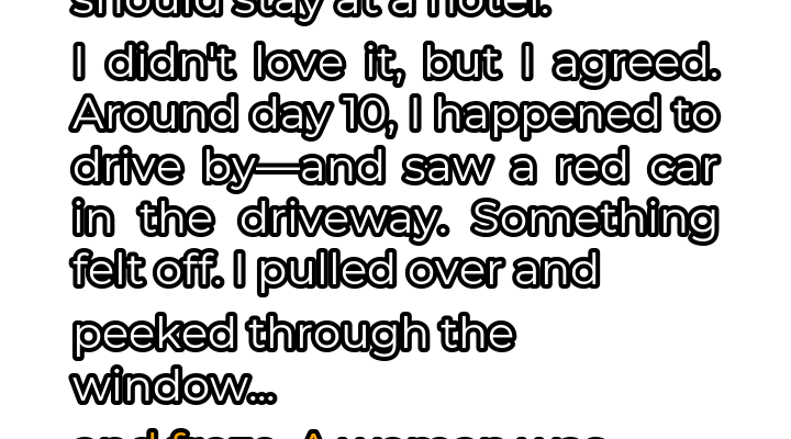 On the tenth day of our hotel stay, I found myself driving near our house. I told myself I was just curious, wanting to see if the “deep clean” was progressing as planned. As I turned onto our street, a bright red car parked in our driveway immediately caught my attention. It was a make and model I didn’t recognize, and a wave of suspicion washed over me. I parked down the street, my heart pounding in my chest, and cautiously approached our house on foot.