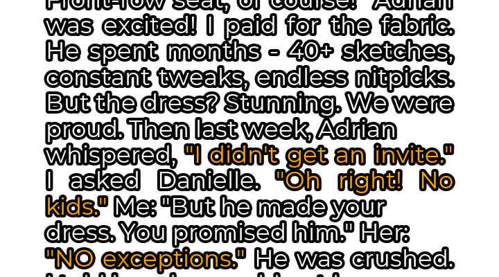 I was floored. “But Danielle,” I protested, “he MADE your dress! You promised him a front-row seat! He poured his heart and soul into this!” Her reply was cold and unwavering. “NO exceptions,” she declared, her voice leaving no room for negotiation. I could see the devastation in Adrian’s eyes. He was utterly crushed, feeling used and unappreciated. He had poured his heart into creating something beautiful for her, only to be excluded from the celebration.