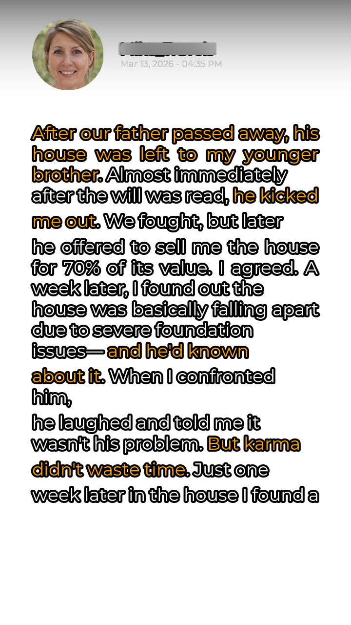 The passing of our father cast a long shadow over our family. The will, read in a sterile lawyer’s office, seemed to amplify the existing tensions between my younger brother, Mark, and me. He inherited the house, the house we both grew up in, the house filled with memories. Almost immediately, I was told to leave. No discussion, no compromise, just a cold, hard eviction notice delivered by my own sibling. The ensuing argument was bitter, filled with years of unspoken resentments bubbling to the surface. I felt betrayed, not just by my brother, but by the very foundation of our family. Then, a week later, a bizarre olive branch. Mark offered to sell me the house. Not at market value, but at 70% of its assessed worth. Suspicion warred with a desperate longing for the familiar, for a place to anchor myself in the wake of my father’s death. I rationalized his offer, clinging to the hope that perhaps this was his clumsy way of reconciliation. I scraped together every penny I had, secured a mortgage, and signed the papers, blinded by a mix of grief and naive optimism.