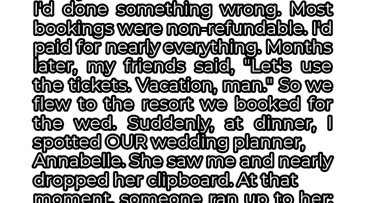 We were at dinner, trying to enjoy a quiet meal, when I saw her. Across the room, standing near the entrance to the ballroom, was Annabelle, our wedding planner. Our eyes met, and her face registered a mixture of shock and panic. She nearly dropped her clipboard, her composure visibly crumbling. Before I could process what was happening, a young woman rushed up to her, her voice filled with urgency.