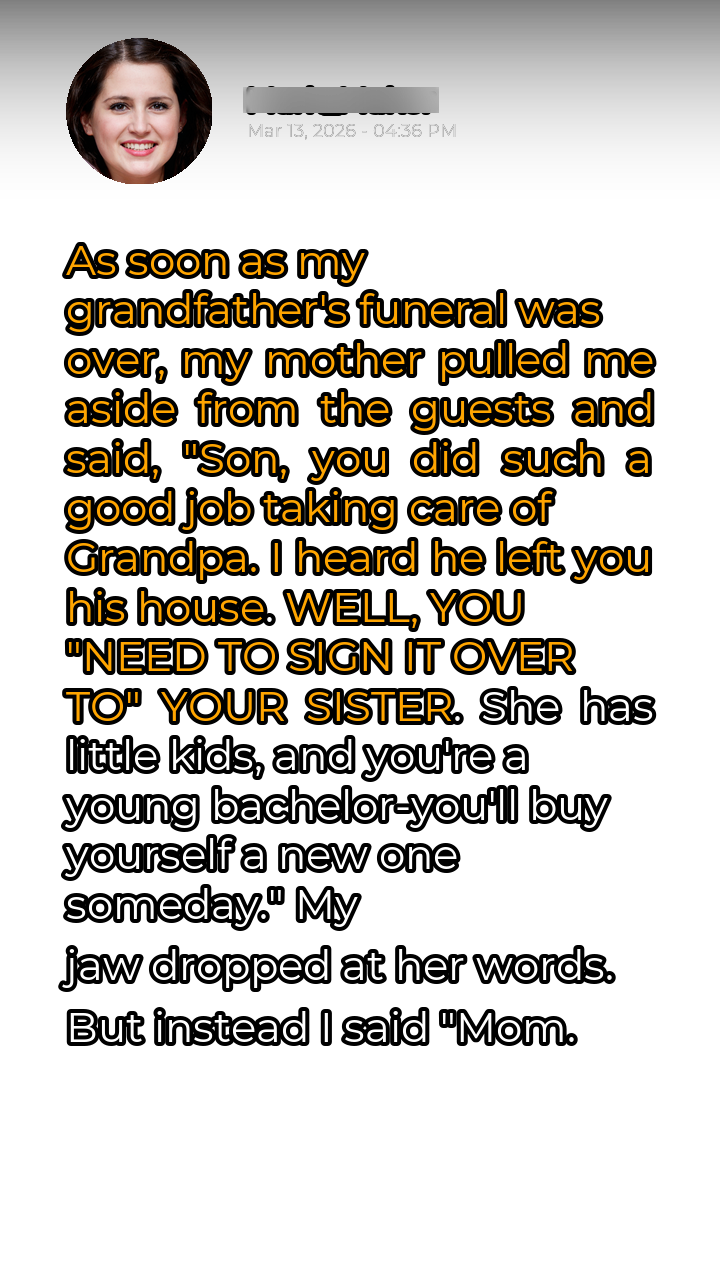 The funeral was a blur of somber faces and hushed whispers. My grandfather, a man who had always been a pillar of strength and wisdom in my life, was now gone. The weight of his absence pressed down on me, a heavy cloak of grief. I had spent the last few years of his life caring for him, ensuring his comfort and well-being. It was a labor of love, a way to repay him for the countless ways he had supported me throughout my life. As the last of the guests began to depart, my mother, ever the pragmatist, pulled me aside. Her eyes, usually filled with warmth, held a strange glint of calculation. “Son,” she began, her voice low and urgent, “you did such a good job taking care of Grandpa. Everyone noticed.” A flicker of hope sparked within me. Perhaps she was finally acknowledging the sacrifices I had made.