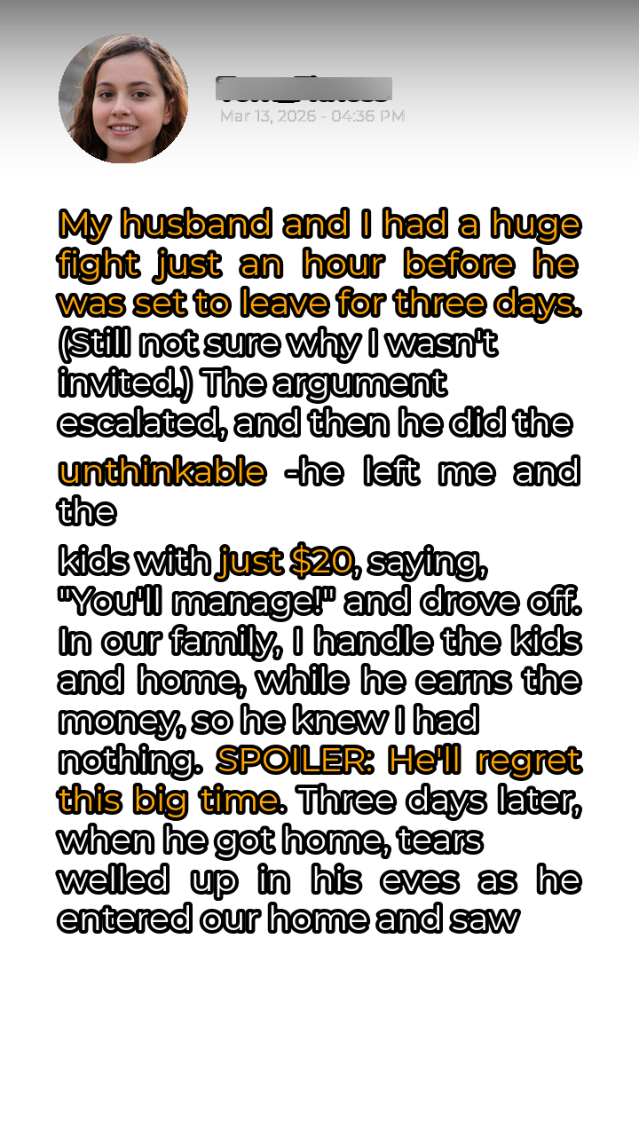The slammed door echoed through the house, a final punctuation mark on the argument that had ripped through their lives just moments before. He was gone, off on a three-day trip, a trip she hadn’t even been considered for. The sting of that rejection was still fresh, but the real blow came with his parting shot: $20. Twenty dollars to manage for three days with the kids. He knew she relied on him for the finances, that she dedicated her days to caring for their children and home. It was a calculated move, designed to assert control. Panic threatened to engulf her. Twenty dollars wouldn’t even cover a single trip to the grocery store. Doubt crept in. Maybe he was right. Maybe she *couldn’t* manage. Maybe she was as helpless as he seemed to believe. But beneath the fear, a spark of defiance ignited. She wouldn’t let him win. She wouldn’t let her children suffer.