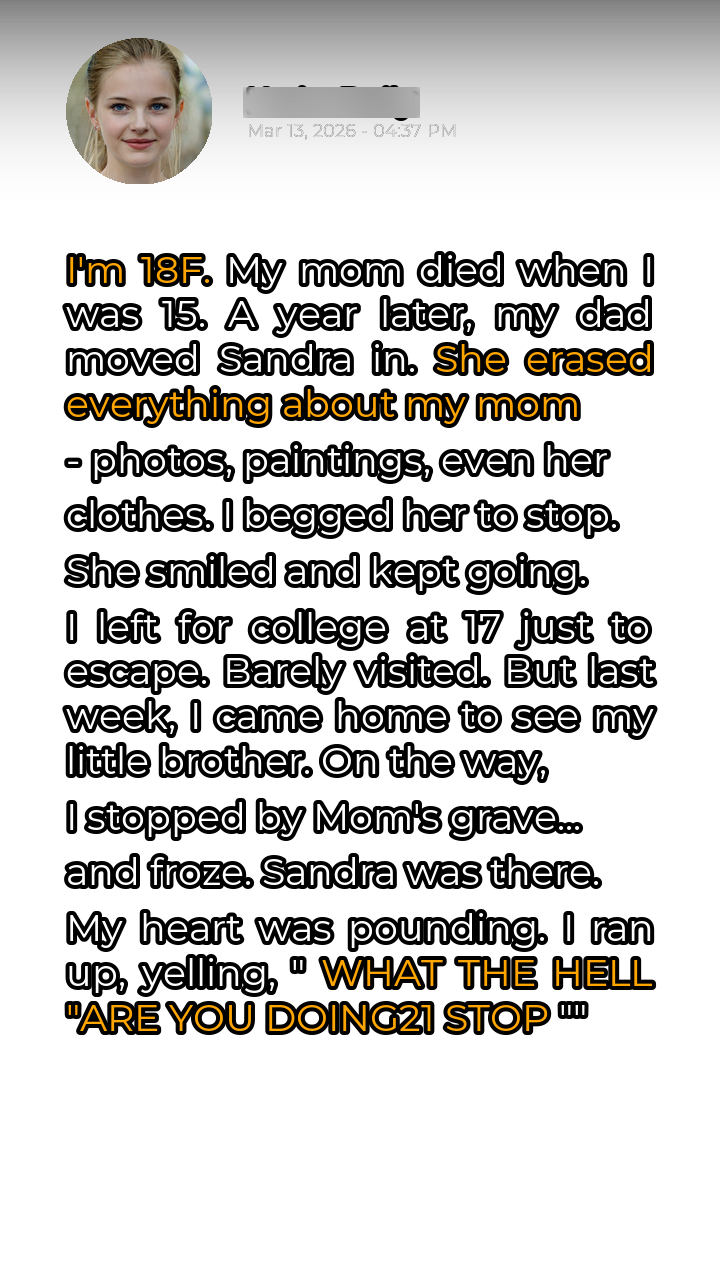 Last week, I decided to visit my brother, a much-needed break from the pressures of college. On the way home, a powerful urge drew me to the cemetery, to my mother’s grave. As I approached, I saw a figure kneeling beside the headstone. My heart pounded in my chest as I recognized Sandra. Rage, long simmering beneath the surface, erupted. I ran towards her, yelling, “What the hell are you doing?!”