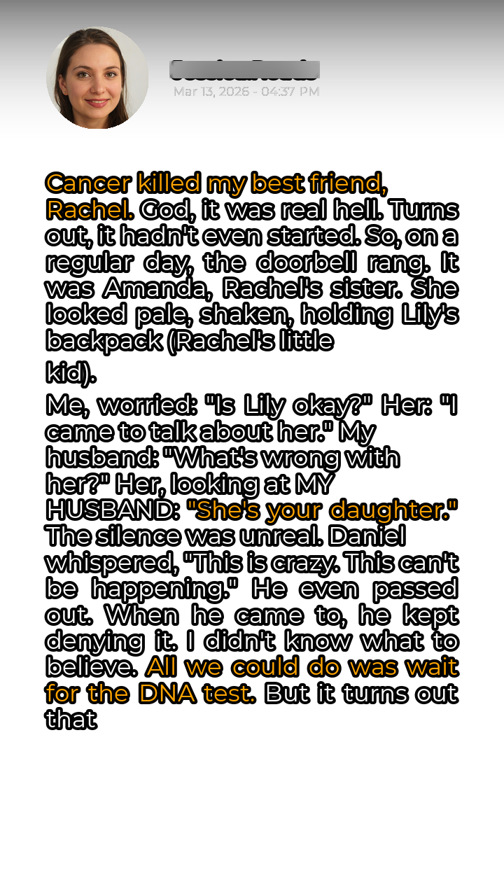 He read the results silently, his expression unreadable. Finally, he looked up at me, his eyes filled with a mixture of pain and regret. “It’s true,” he whispered, his voice hoarse. “Lily is my daughter.” The world as I knew it crumbled around me. Rachel, my best friend, had kept a secret, a secret that had the power to destroy everything I held dear. Our grief became tangled with betrayal, and the future we’d imagined shattered into a million pieces.