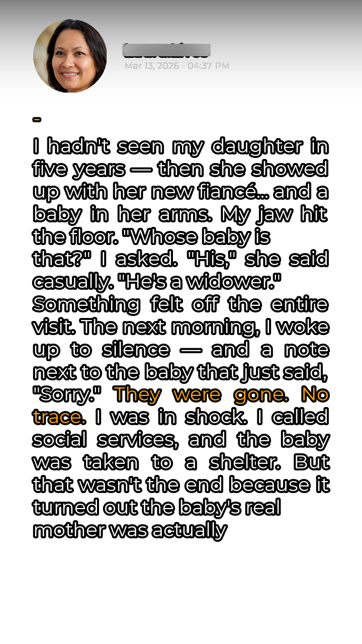 [BLOG_BODY] Five years. Five years since I last saw Emily. We had a falling out, a stupid argument fueled by youthful rebellion and parental stubbornness. I regretted it every single day, but pride kept me from reaching out. Then, out of the blue, she called. She was coming home, she said, with her fiancé, David. My heart leaped. This was it, a chance to mend fences, to rebuild what had been broken. The moment I opened the door, I knew something was off. Emily looked different, older, guarded. David was polite, but distant. And then I saw the baby, nestled in Emily’s arms. “Whose baby is that?” I blurted out, the question hanging in the air like a lead weight. “His,” Emily replied, gesturing towards David. “He’s a widower.” The explanation felt flimsy, a hastily constructed facade.