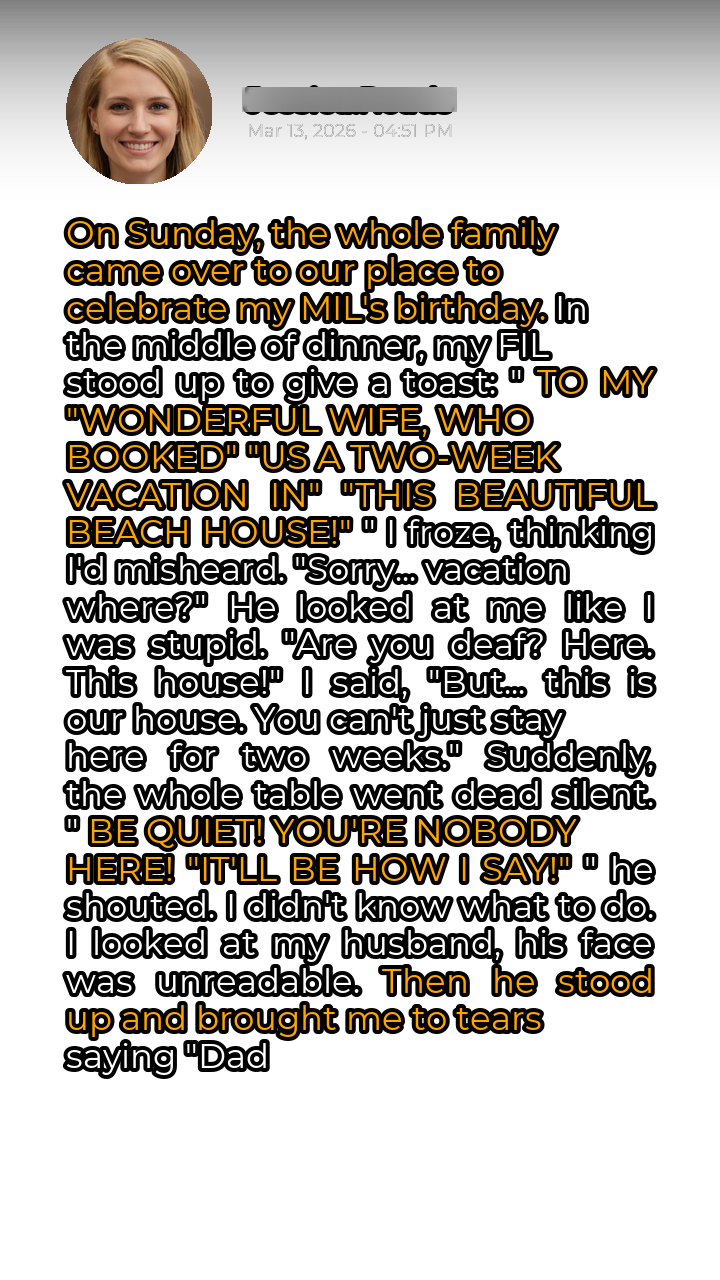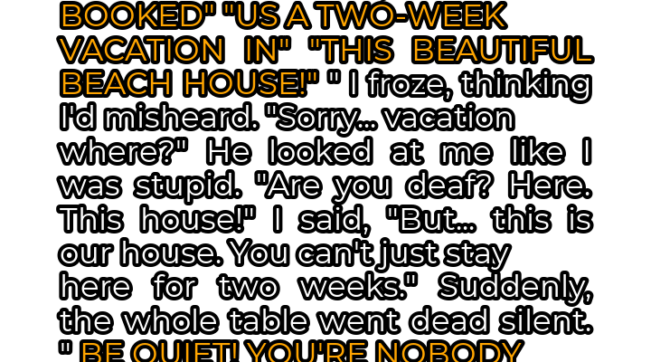 “To my wonderful wife,” he began, his voice booming through the room, “who booked us a two-week vacation in this beautiful beach house!” My blood ran cold. Had I misheard him? A knot of dread tightened in my stomach. “Sorry… vacation where?” I managed to stammer, my voice barely a whisper. He fixed me with a condescending stare, as if I were a simpleton. “Are you deaf? Here. This house!”