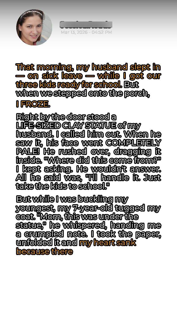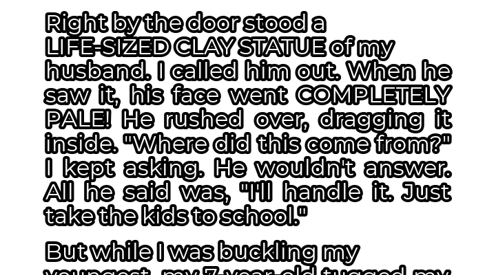 That morning started like any other. My husband, Mark, was “recovering” from a nasty flu, conveniently taking a sick day while I wrestled our three kids into some semblance of readiness for school. The usual chaotic symphony of breakfast demands, missing shoes, and sibling squabbles filled our small house. I was just relieved to finally be herding them out the door. Little did I know, stepping onto that porch would unravel everything I thought I knew about my life. The sight that greeted me was surreal. Standing sentinel right by our front door was a life-sized clay statue, an uncanny replica of Mark himself. It was unsettlingly detailed, capturing his posture, even the slight furrow in his brow. I froze, a wave of unease washing over me. What in the world was this?