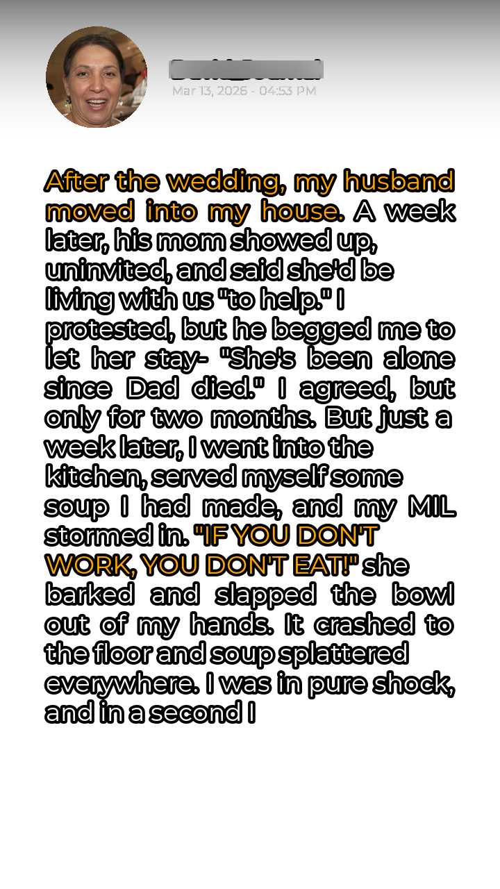 “IF YOU DON’T WORK, YOU DON’T EAT!” she shrieked, her voice filled with venom. Before I could react, she slapped the bowl out of my hands. The soup splattered everywhere – across the floor, the cabinets, and even on me. I stood there, stunned and speechless, as Carol continued her tirade. She accused me of being lazy, ungrateful, and a terrible wife.