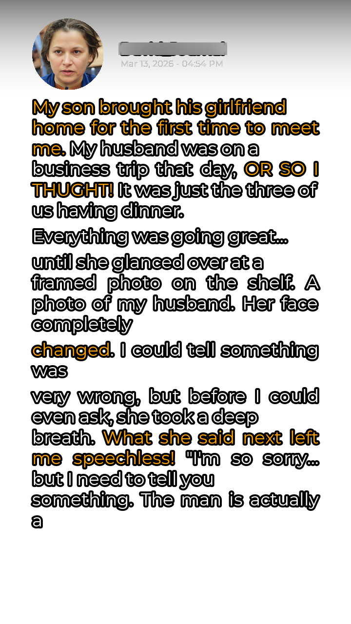 My son, bless his heart, was beaming. He’d been talking about Sarah for months, and finally, the day had arrived for her to meet me. My husband, Mark, was supposedly away on a business trip, a fact that Sarah knew. It was just going to be the three of us, a relaxed Sunday dinner to get acquainted. The aroma of roast chicken filled the air, a comforting scent that usually calmed my nerves. Sarah was lovely, intelligent, and genuinely seemed to adore my son. We chatted about her studies, her family, her dreams. Everything felt… normal. Too normal, perhaps. Then, she glanced over at the bookshelf, a collection of family photos spanning decades. Her eyes fixated on one particular frame, a picture of Mark from a few years back, taken during a summer vacation.