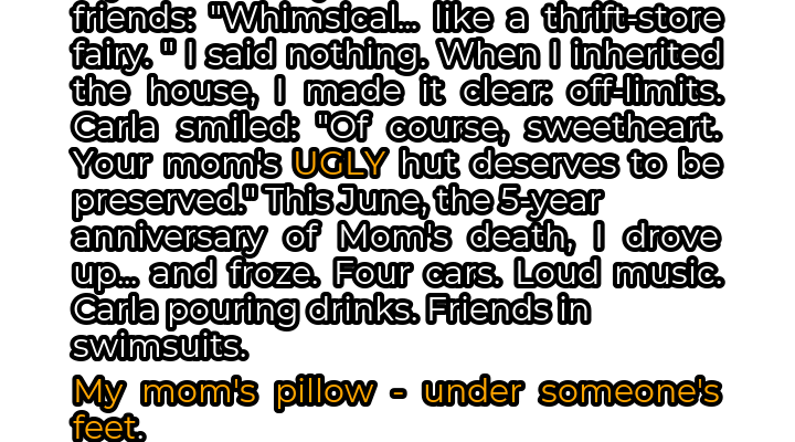 As I drove down the familiar dirt road, I heard the music first: loud, thumping bass that vibrated through the trees. Then I saw the cars, four of them parked haphazardly in the driveway. And finally, I saw them: a group of people in swimsuits, laughing and drinking on the deck. Carla was there, of course, her platinum blonde hair gleaming in the sun as she poured cocktails.