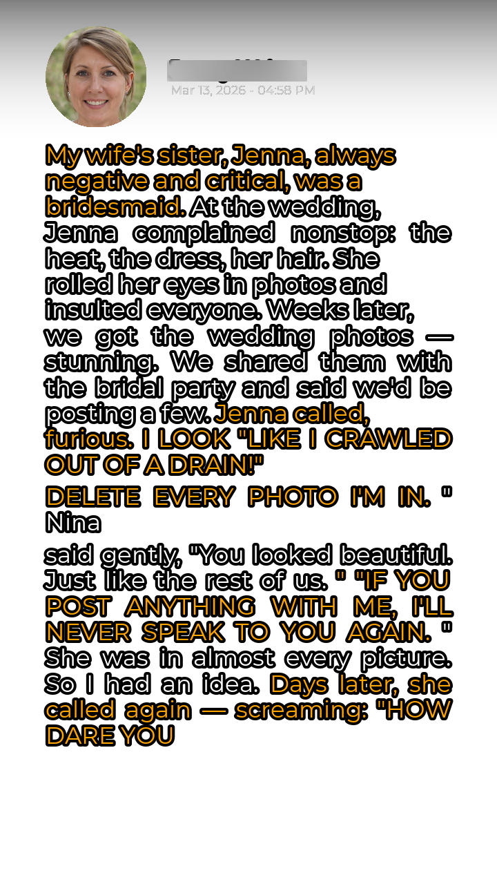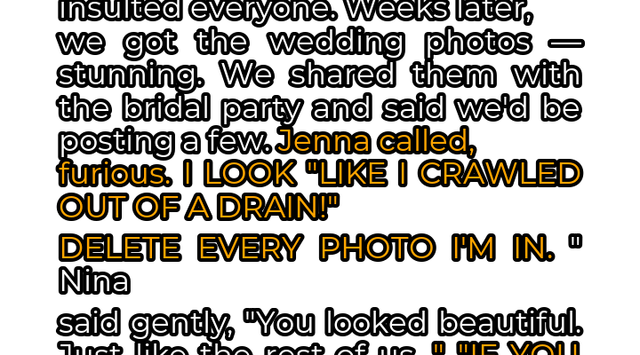 Nina felt trapped. She didn’t want to cave to Jenna’s demands, but she also didn’t want to lose her husband’s sister forever. The joy of the wedding photos was now tainted by Jenna’s negativity and threats. After talking with her husband, Nina came up with a plan, a way to both honor Jenna’s wishes (sort of) and preserve the memories of her special day.