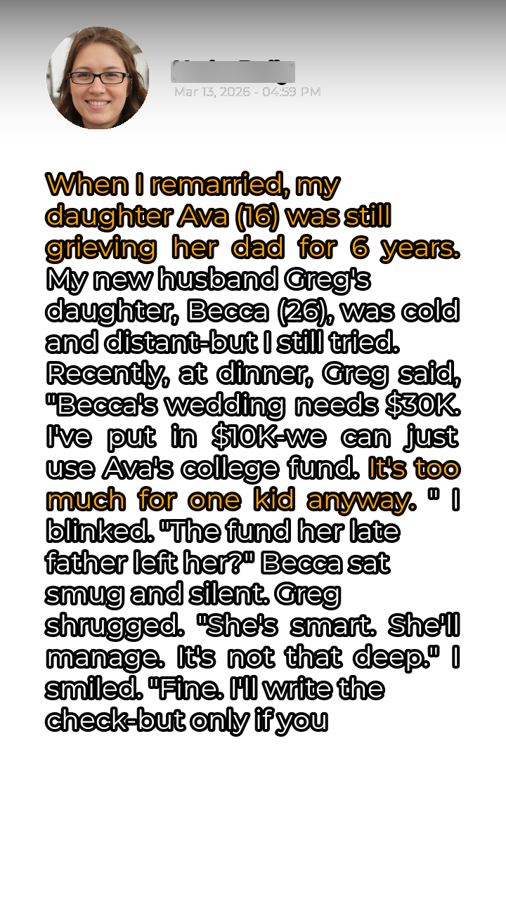Finally, after what felt like an eternity, Greg spoke. His voice was low and grudging. “Fine,” he said. “We agree.” Becca remained silent, her eyes still blazing with anger, but I could see the resignation in her posture. I knew it wouldn’t be easy, but I had drawn a line in the sand. I had protected my daughter, and I had honored her father’s memory. And in that moment, I knew I had done the right thing, no matter what the cost. The wedding went ahead, significantly scaled down, and Greg, to his credit, worked tirelessly to replenish Ava’s college fund. The apologies, while not entirely heartfelt, were delivered. Our blended family was far from perfect, but it was built on a foundation of respect, however grudgingly given.