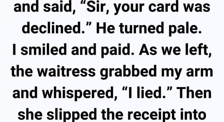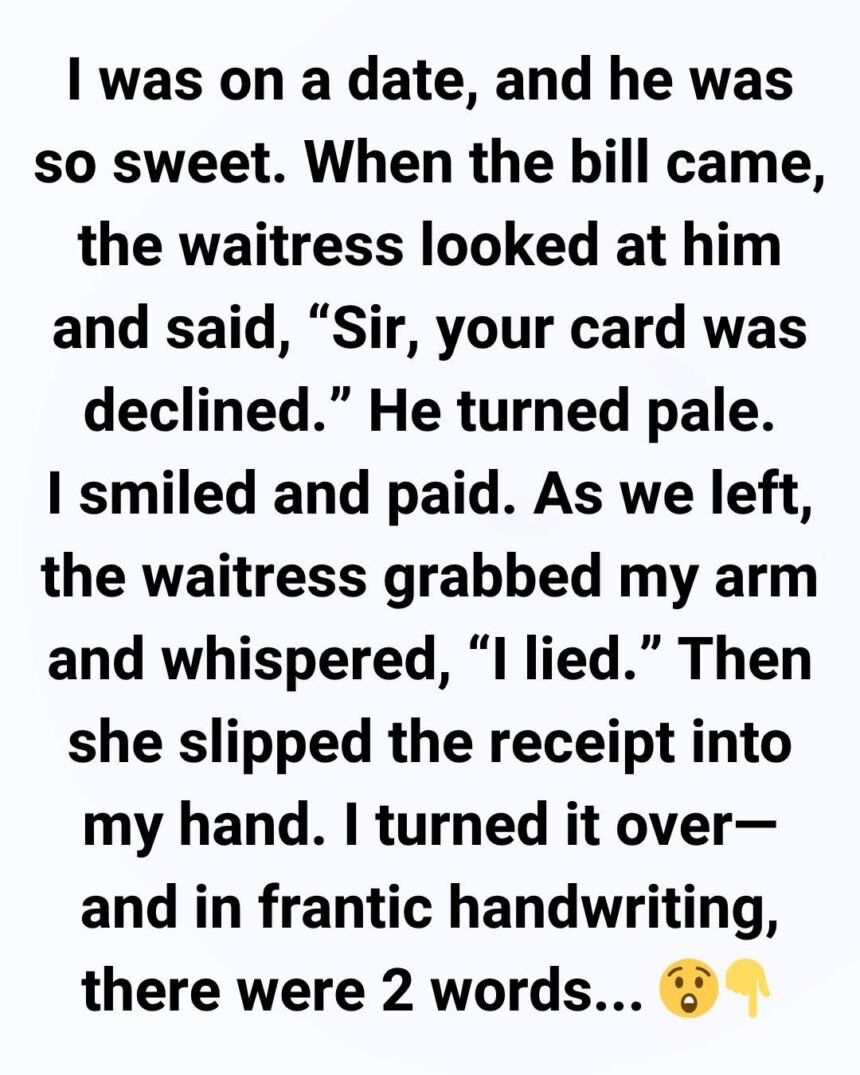 I couldn’t be more grateful to that waitress. Her courage, kindness, and quick thinking saved me from something terrible. I realized she had staged the declined card incident just to have an excuse to slip me that message.