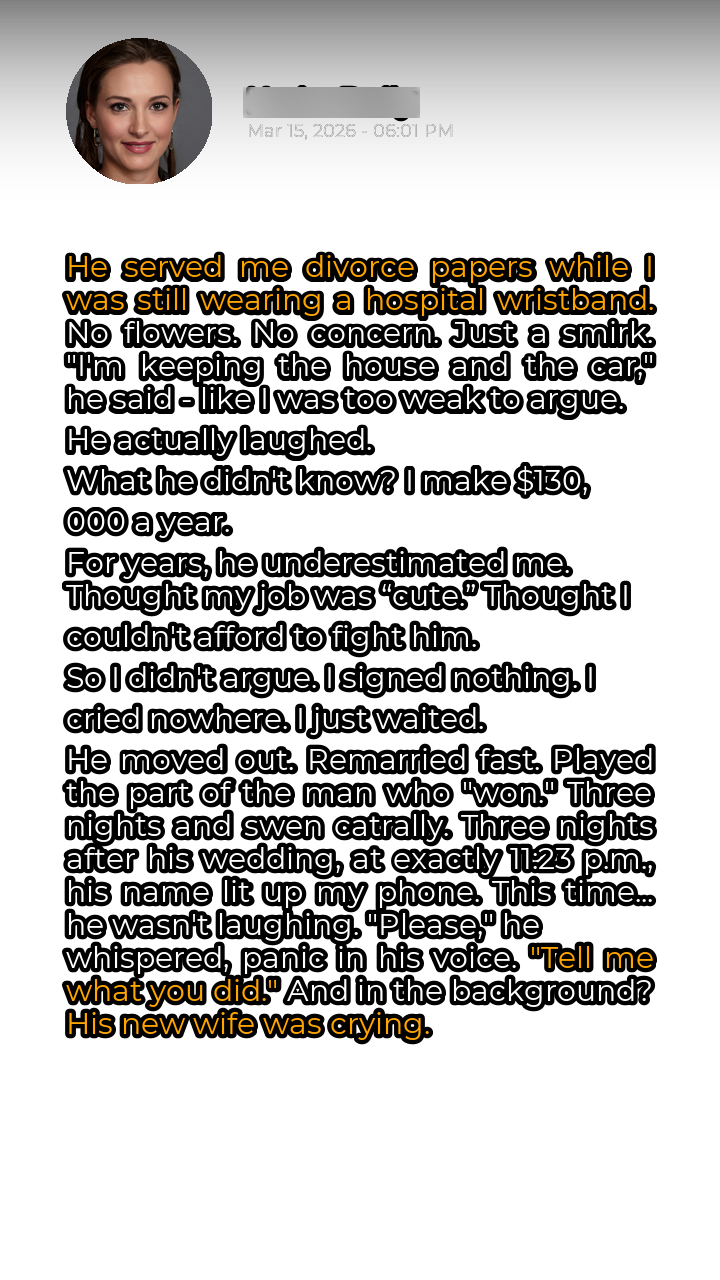 Three nights after Mark’s extravagant wedding, at precisely 11:23 PM, Sarah’s phone rang. It was Mark. His voice was a strained whisper, barely audible above the background noise. “Please,” he begged, panic lacing every syllable. “Tell me what you did.” In the background, Sarah could hear the unmistakable sound of a woman crying – his new wife. It turned out that Sarah had subtly, yet devastatingly, undermined his financial stability. Before the divorce, she had quietly invested in a small tech company that had just exploded in value. Because it was technically still during the marriage, he was entitled to half. Only, he had already spent all of his assets on the wedding, the new house, and the new wife. He was broke. The tears were from his new wife, who had just discovered the truth about her “successful” husband’s financial situation. He had nothing. The house, the car, everything would be liquidated to pay her. Sarah simply hung up the phone, a small smile playing on her lips. Justice, it seemed, had been served.