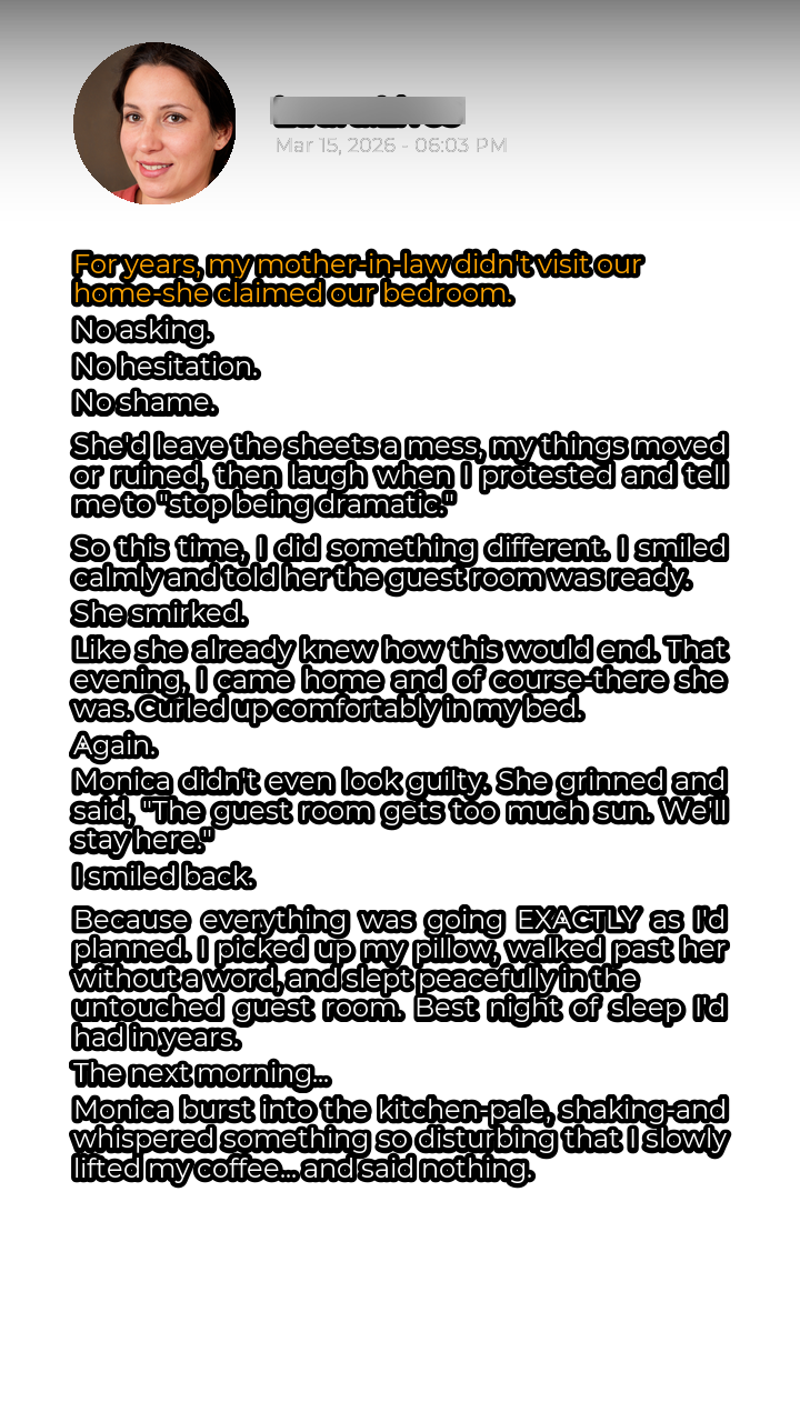 The next morning, the tables had turned. Monica burst into the kitchen, her face ashen, her hands trembling. She looked like she’d seen a ghost. She whispered something so unsettling, so profoundly disturbing, that I slowly lifted my coffee mug to my lips, took a long, deliberate sip, and said nothing. The silence hung heavy in the air, punctuated only by the clinking of my mug against the saucer. Whatever she had experienced in my bedroom that night had shaken her to her core, and the satisfaction I felt was a slow-burning fire that warmed me from the inside out. The game had changed, and for the first time in years, I was holding all the cards. But what did Monica see? And what could possibly make a woman so confident, so arrogant, so utterly shaken to her core that her face drained of all color? The answer to this question is something that will forever stay between us.