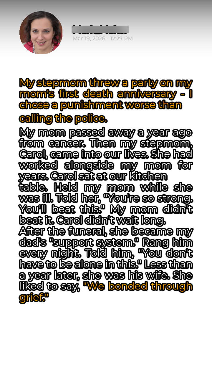 As Carol began a toast, thanking everyone for their support and celebrating her “new beginning,” I stepped forward. With a trembling hand, I plugged my phone into the sound system. The music faded, and a hush fell over the room. Then, my mom’s voice filled the air. “Carol, thank you so much for being such a wonderful friend and support,” the recording began, a genuine expression of gratitude from a woman who trusted her implicitly.