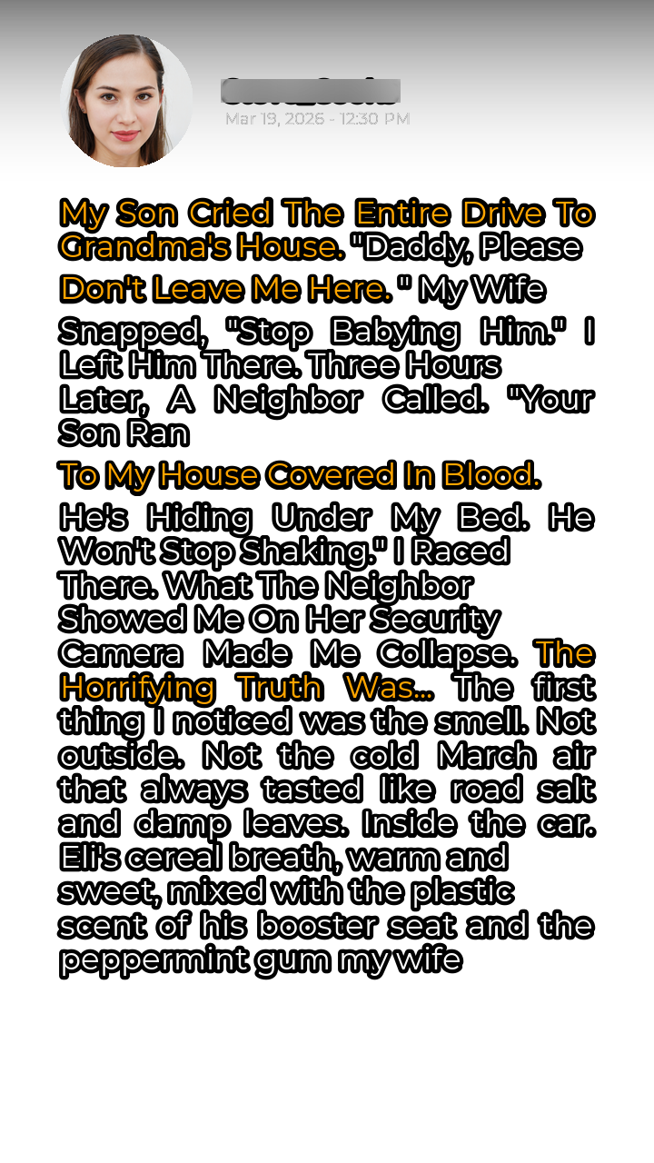 The first thing I noticed was the smell. Not outside. Not the cold March air that always tasted like road salt and damp leaves. Inside the car. Eli’s cereal breath, warm and sweet, mixed with the plastic scent of his booster seat and the peppermint gum my wife habitually chewed. But beneath it all, a faint undercurrent of something else. Something…off. Eli had been unusually clingy that morning, wrapping his small arms around my neck, refusing to let go. “Daddy, please don’t go,” he’d whimpered, his big brown eyes filled with a terror I couldn’t understand. My wife, Sarah, had rolled her eyes. “He’s just being dramatic. He loves Grandma’s house.” She was always so practical, so focused on toughening him up. I trusted her judgment, maybe a little too much. “He needs to learn to be independent,” she’d insisted. So, I pried his arms loose, ignoring the way his tiny body trembled. I told myself it was just separation anxiety.