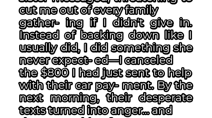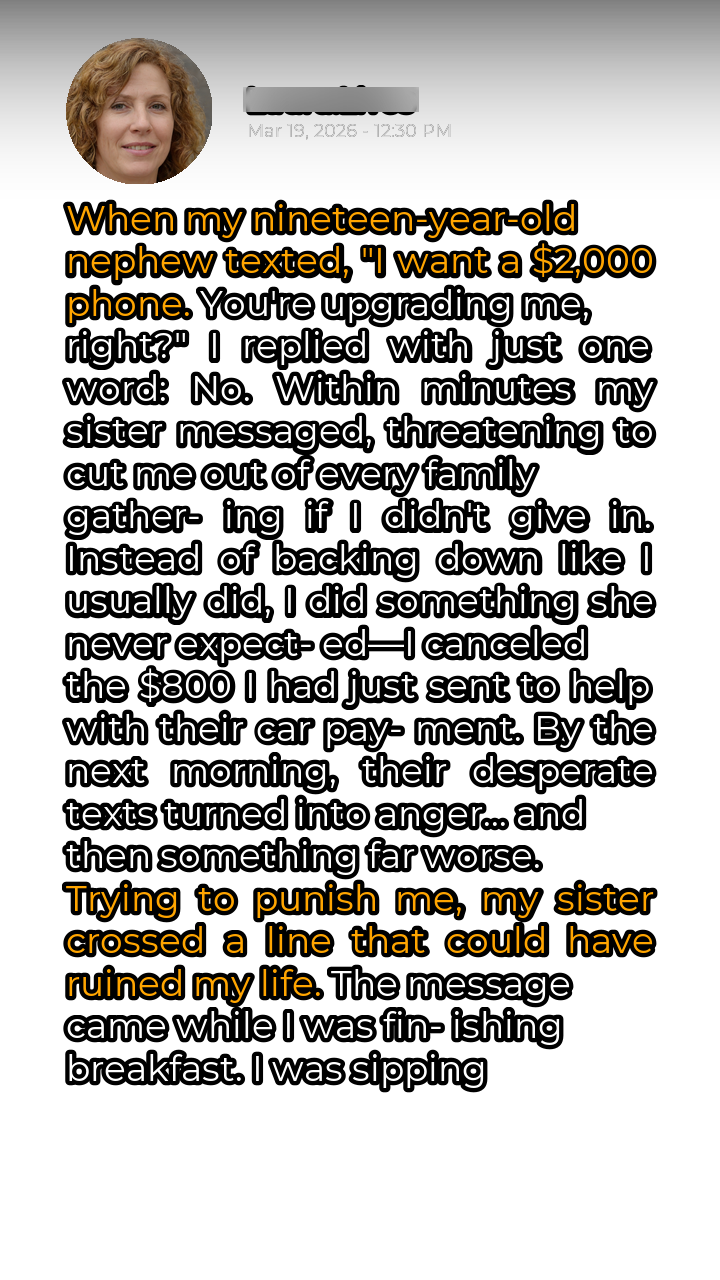 Instead of backing down, I did something completely out of character. I canceled the $800 I had just sent to help with their car payment. They had been complaining about being short, but if they had money for a $2000 phone, they clearly did not need the help. The next morning, my phone exploded with a barrage of texts. At first, they were desperate pleas, begging me to reconsider. Then, as the reality of the situation sunk in, the tone shifted to anger. But that was just the beginning.