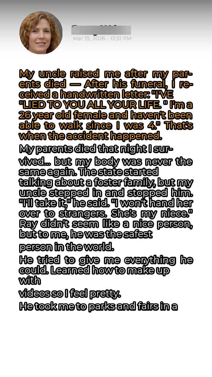 My life has always been defined by two distinct chapters: before the accident and after. Before, I was a carefree four-year-old, running and playing without a second thought. After, I was confined to a wheelchair, the victim of a tragic car crash that claimed the lives of my parents and stole my ability to walk. The world shrunk, and my existence became a series of doctor’s appointments, physical therapy sessions, and the constant, dull ache of loss. The state intervened, naturally, discussing my future with hushed voices and grim faces. Foster care seemed inevitable, a terrifying prospect for a scared little girl who had already lost everything. But then, my Uncle Ray stepped in. Ray was an enigma, a gruff, solitary man who always seemed to keep the world at arm’s length. He wasn’t the warm, nurturing type, but he possessed a quiet strength and an unwavering resolve. “I’ll take her,” he declared, his voice firm. “I won’t hand her over to strangers. She’s my niece.” And just like that, he became my guardian, my protector, my family.