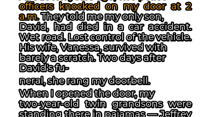 The knock at the door still echoes in my memory. Two AM. The flashing lights of the police car painting grotesque shadows on my living room wall. The words “car accident,” “David,” and “deceased” blurring into a nightmarish symphony of grief. My only son, gone. My world, irrevocably shattered. His wife, Vanessa, emerged from the wreckage relatively unscathed, or so it seemed. Two days after the funeral, Vanessa showed up at my doorstep. My two-year-old twin grandsons, Jeffrey and George, stood before me in their pajamas, clutching worn teddy bears. Behind them, Vanessa shoved a black trash bag filled with their meager belongings towards me. Her words cut deeper than any knife: “I’m not cut out for this poverty stuff. I want to live my life.” And with that, she turned and walked away, leaving me with the shattered pieces of my son’s legacy.