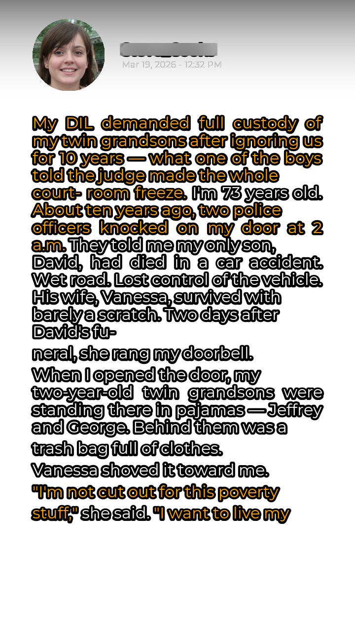 The courtroom erupted in chaos. Vanessa gasped, her face turning ashen. Her lawyer jumped to his feet, objecting vehemently. The judge banged her gavel, struggling to restore order. George’s words hung in the air, a bombshell dropped in the middle of the proceedings. The truth, buried for ten years, had finally surfaced, revealed by the innocent lips of a child. An investigation was launched, and Vanessa was charged with vehicular manslaughter. The judge, upon hearing the evidence, awarded me permanent custody of my grandsons, ensuring they would remain in the loving home they had always known.