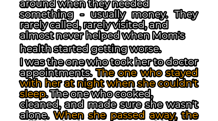 My mother, Sarah, and I shared a bond that most people only dream of. Of her three daughters, I, Emily, was undoubtedly the closest. My older sisters, Jessica and Amanda, were beautiful and successful, but their presence in Mom’s life was often transactional. A phone call meant they needed something, a visit usually involved a request for money. As Mom aged and her health began to falter, their appearances became even more infrequent. I, on the other hand, was a constant. I rearranged my life to accommodate her needs. Doctor appointments became my responsibility, and I navigated the complex world of specialists and medications. Sleepless nights were spent holding her hand, soothing her anxieties, and ensuring she never felt alone. I cooked her meals, cleaned her house, and filled her days with laughter and companionship. I truly believed that my unwavering devotion had solidified our bond, creating a connection that transcended mere familial obligation.